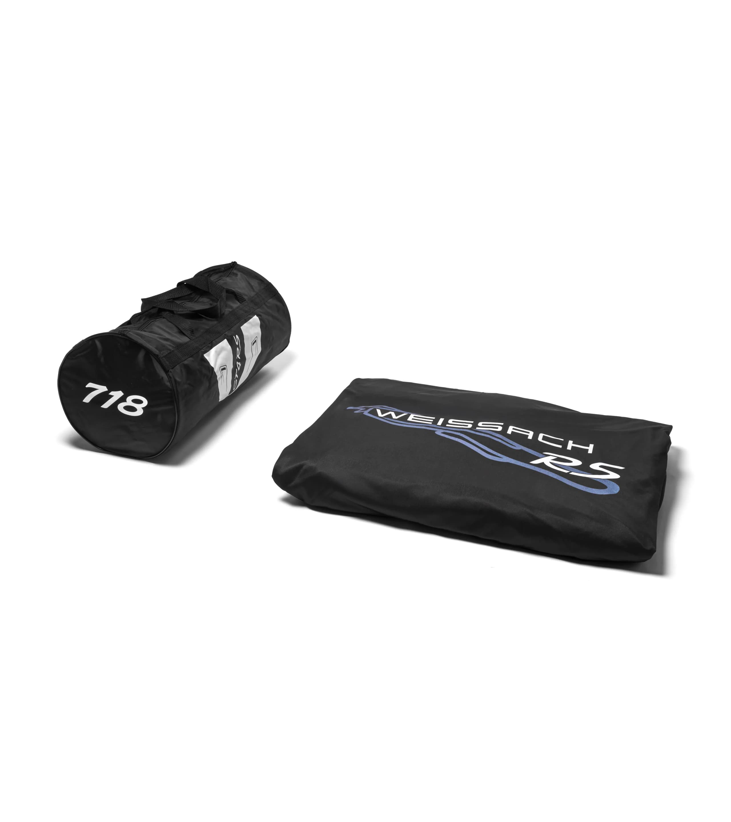 In 718 Cayman GT4 RS design with piping in Arctic Grey, 'Weissach package' logo in White-Arctic Grey on the hood, model logo on the side and White 'PORSCHE' lettering on the rear wing.