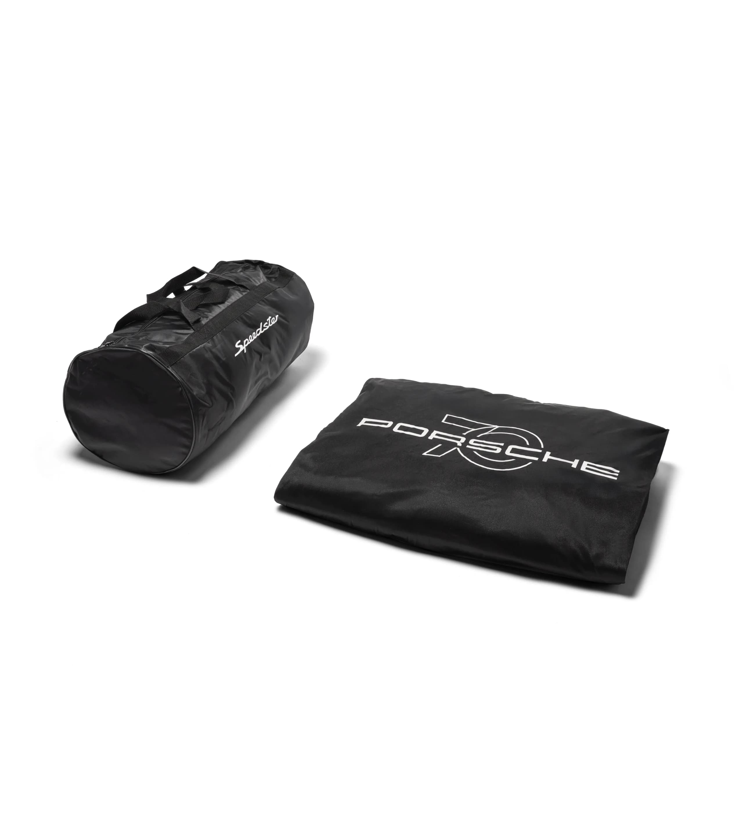 Custom-fit black indoor car cover made from breathable, antistatic and dirt-resistant material. In "70 Years of Porsche" Design with piping, side "Speedster" logo and "70 years of Porsche" logo in silver colour.
