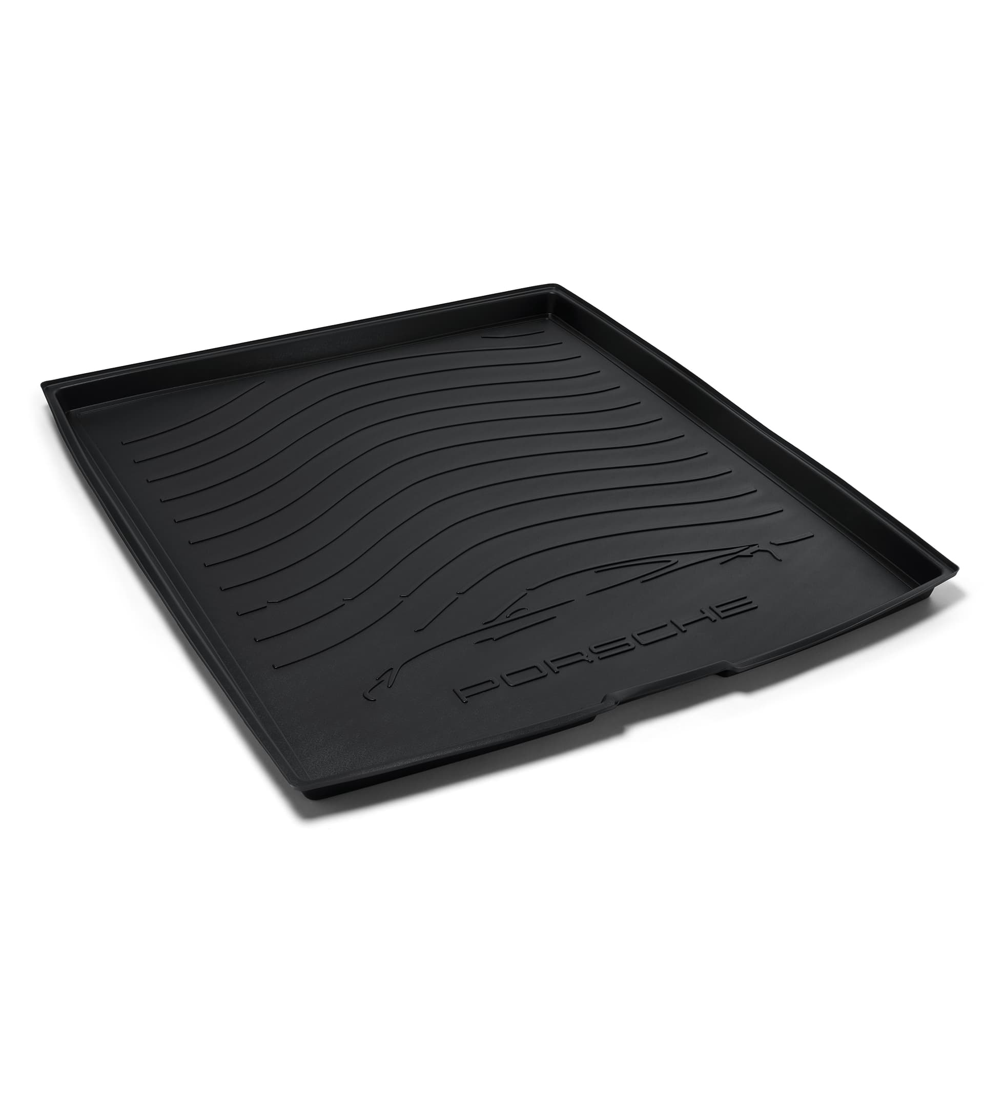 Custom-fit protective liner in Black with vehicle silhouette and "PORSCHE" logo. Waterproof and washable.