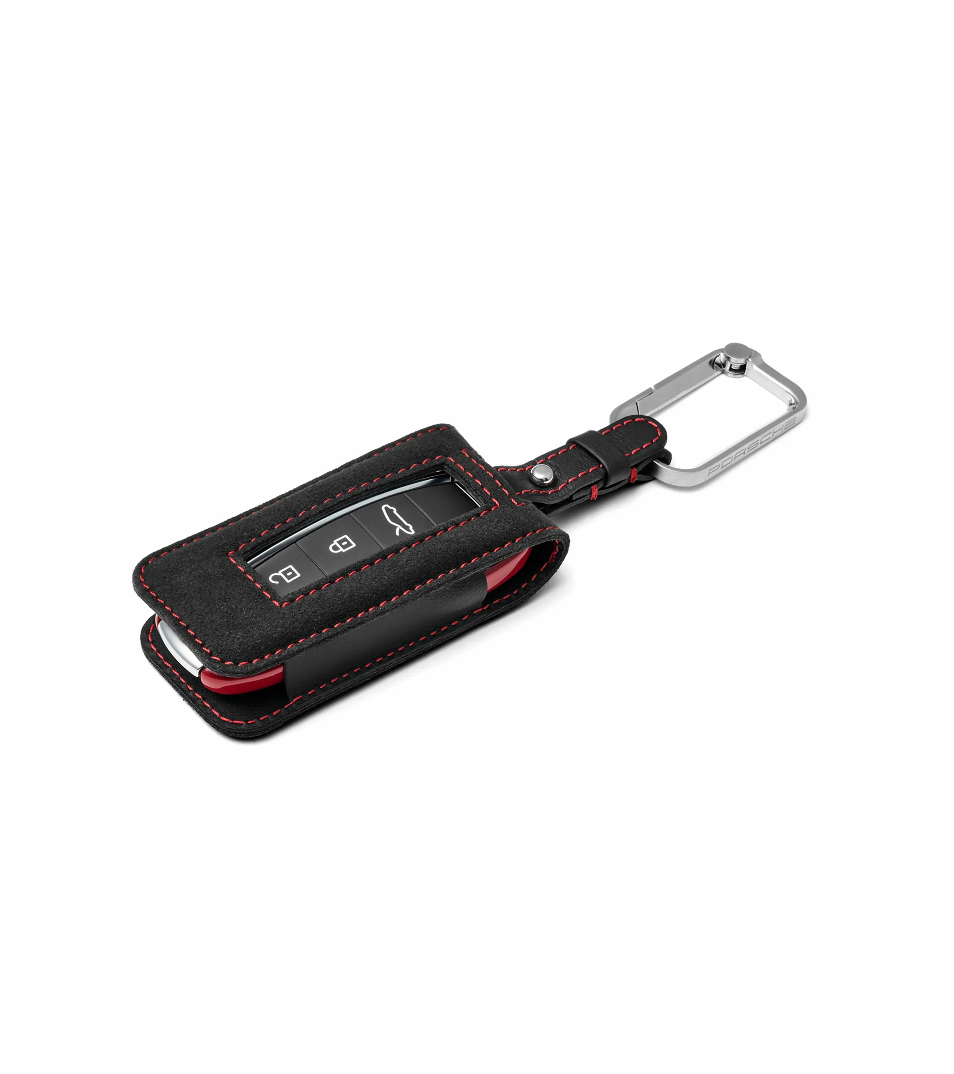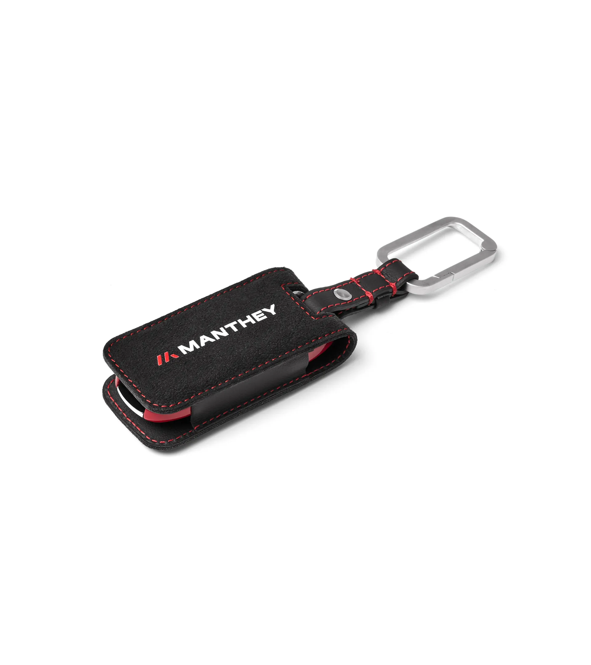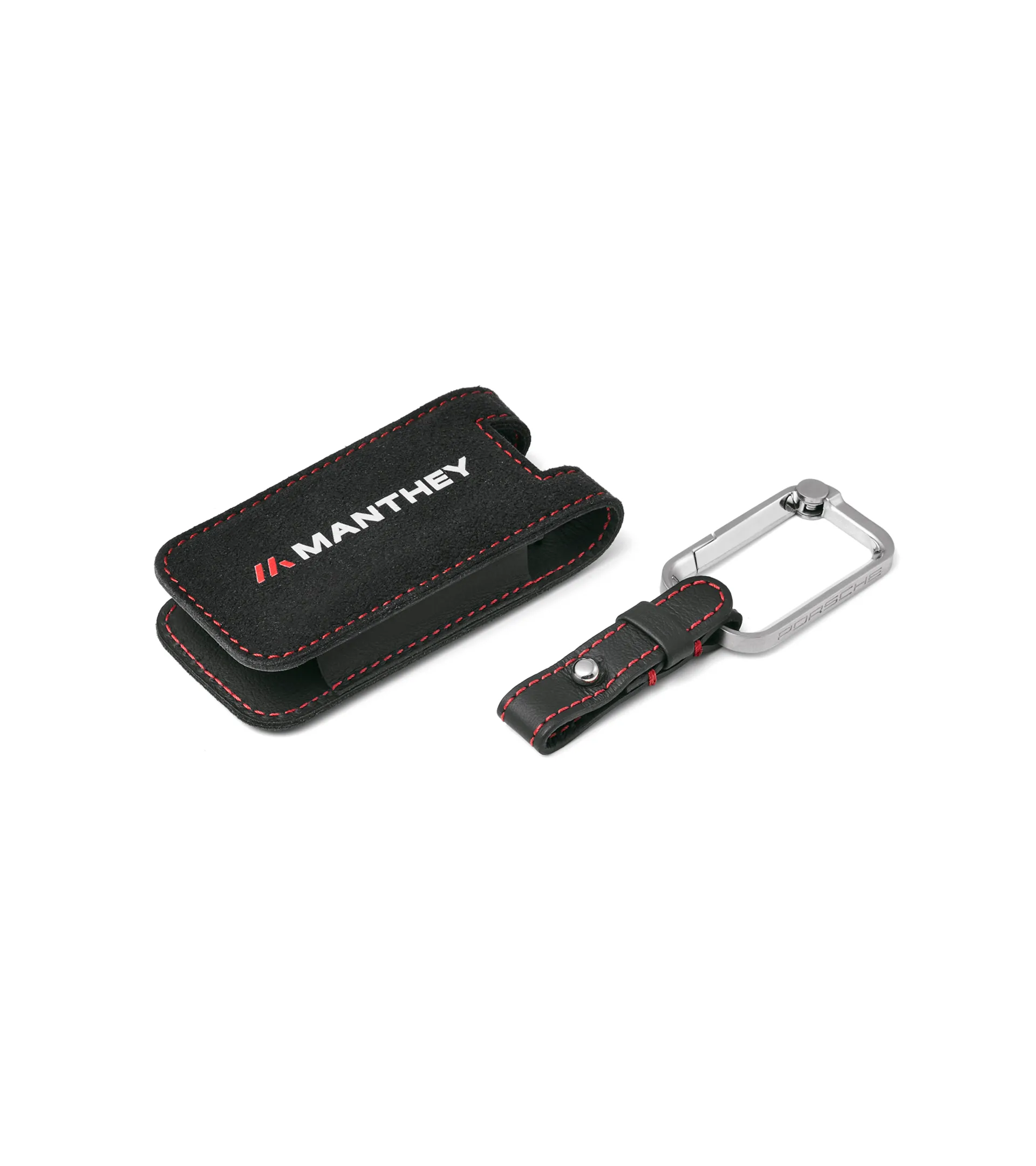 The perfect addition to the driver's key of a true motor sports fan: the key pouch made of Black Race-Tex with printed Manthey lettering and Red decorative stitching. The side bolsters and the lanyard are made of Black leather.