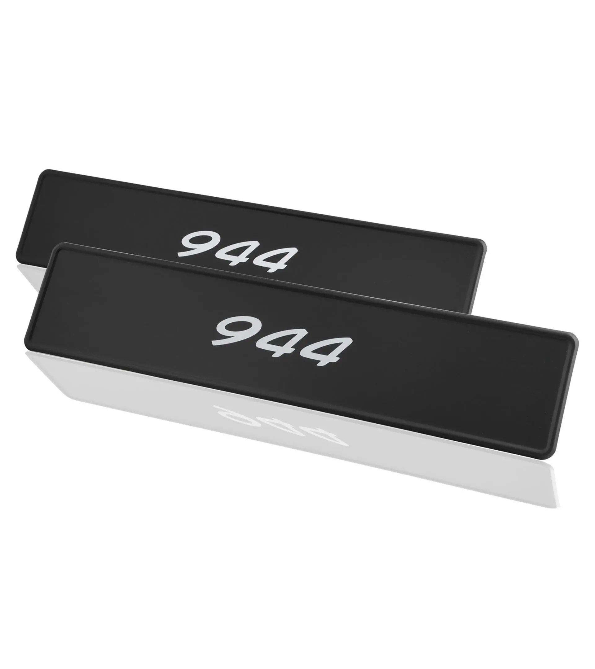 Black number plate with white "944" imprint measuring 11x52 cm; suitable for Porsche 944 from model years 1982 to 1991. Content: 2 pieces.