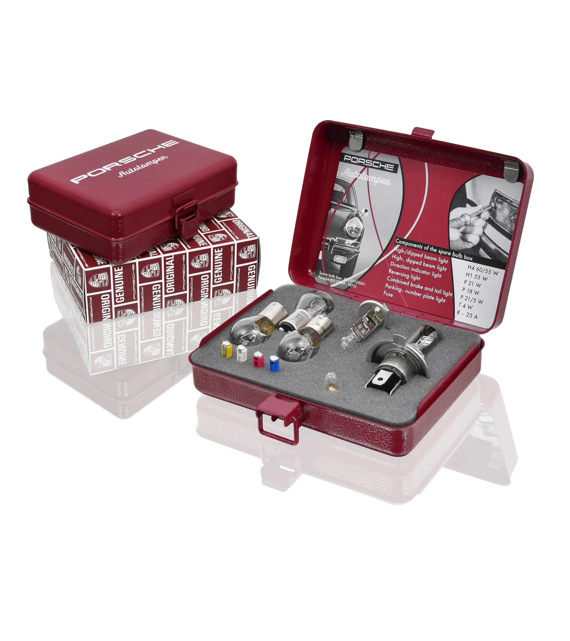 The bulbs and fuses are stored in a metal box in historic Porsche Red, with raised Porsche lettering in White and a foam insert inside.