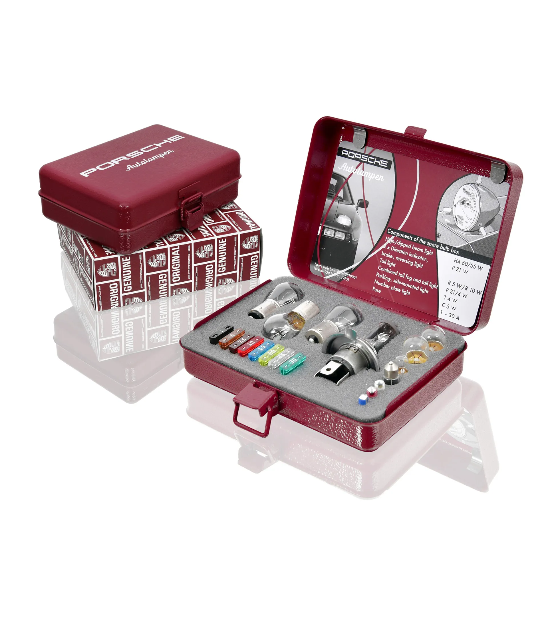 The bulbs and fuses are stored in a metal box in historic Porsche Red, with raised Porsche lettering in White and foam inserts inside.