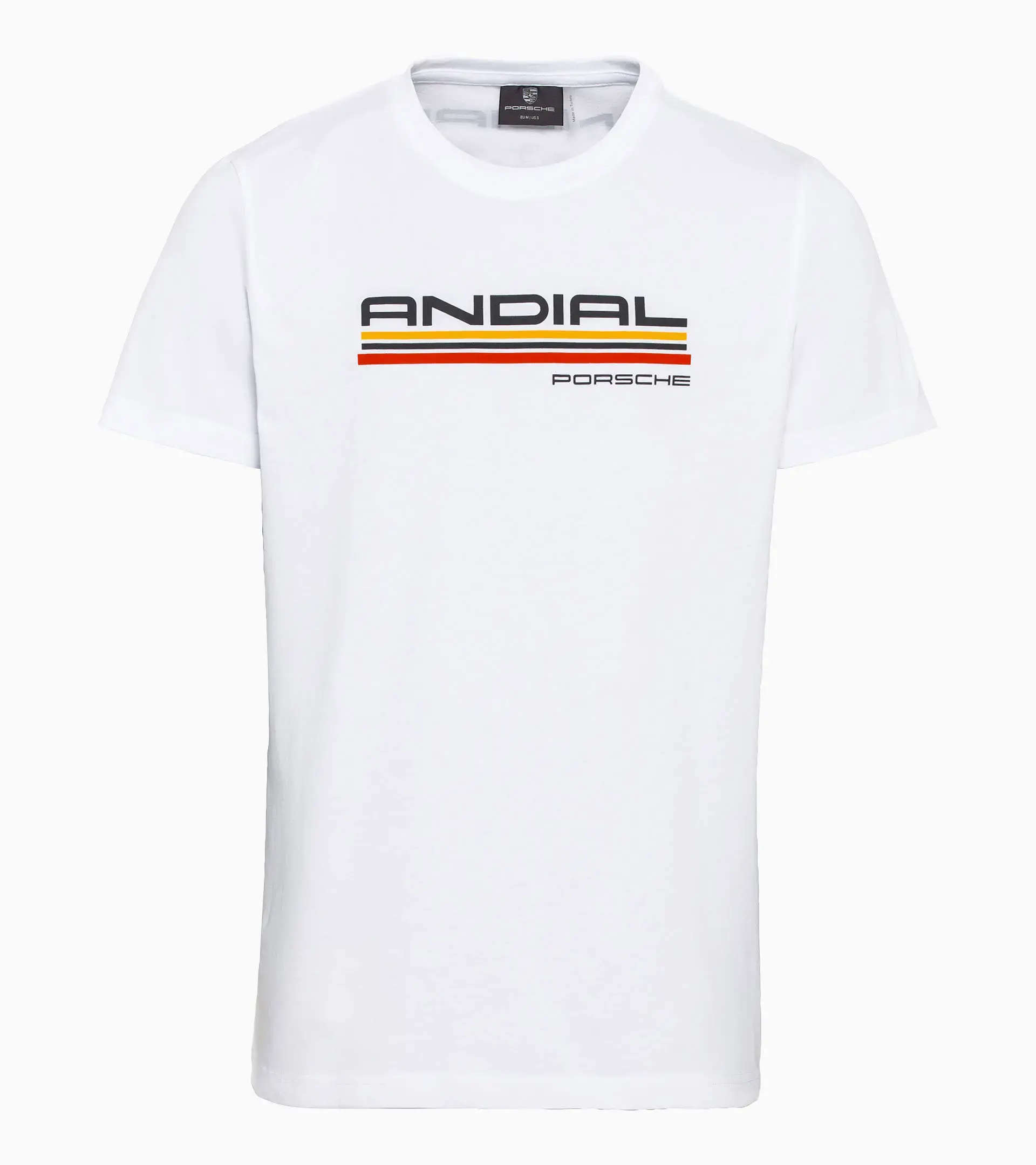 Celebrating ANDIAL, a staple of Porsche racing history, and the iconic 935-L ‘Moby Dick’ race car from the 80’s. White short sleeve t-shirt with colored ANDIAL print on the front and back.