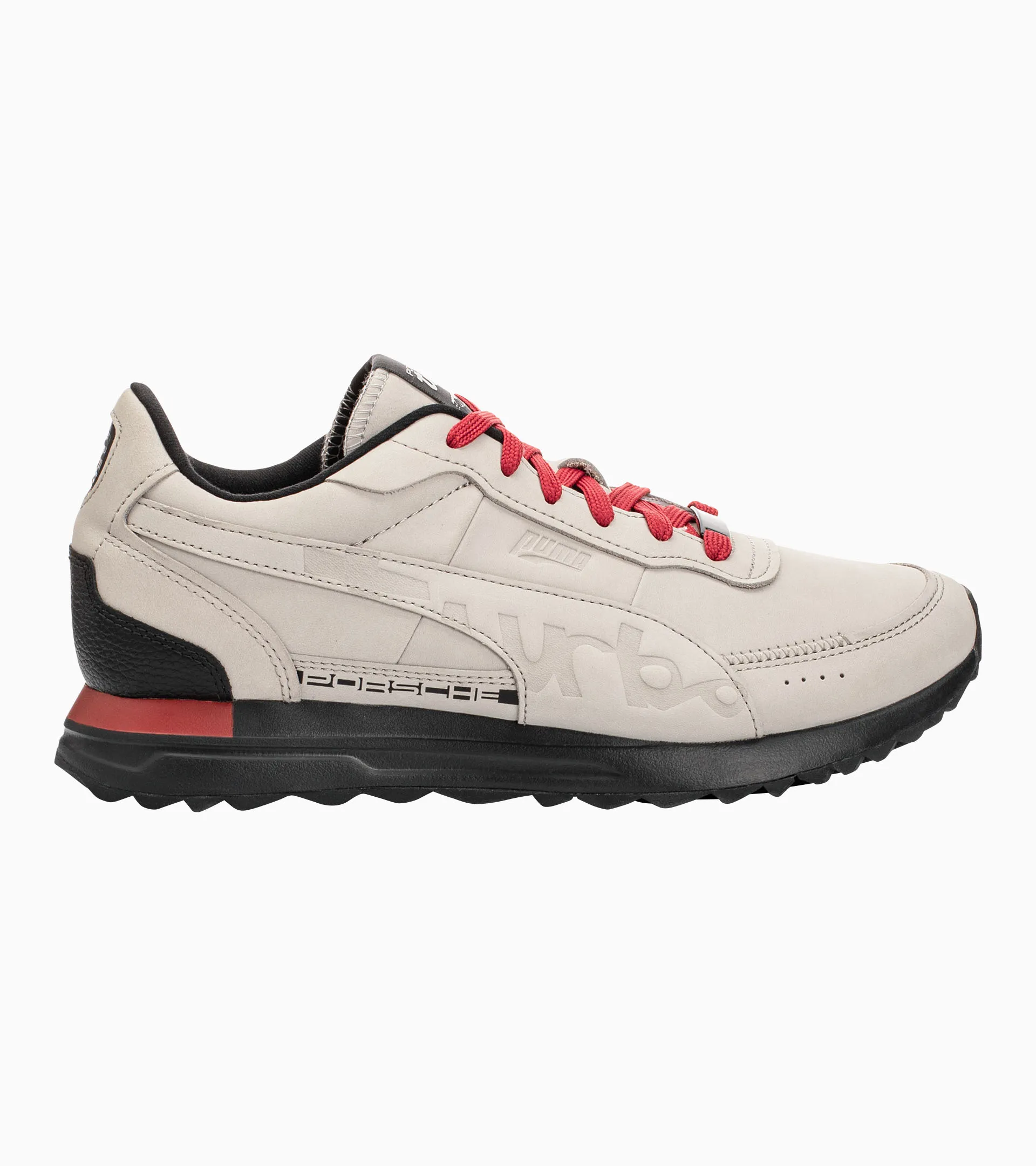 Perfekt für alle, die ein Stück Porsche Geschichte am Fuß tragen wollen: der 50Y 911 Turbo Sneaker „Germany“ feiert mit detailreichem Design das 50-jährige Jubiläum des Porsche 911 Turbo. Das Nubukleder ist angelehnt an die Exterieurfarbe Kreide, die heute die beliebteste Exteriorfarbe in der Porsche-Welt ist und verbindet damit Vergangenheit mit Gegenwart. Der Porsche Schriftzug, der als Beklebung für den Sportwagen bestellbar war, den Schuh zum wahren Eyecatcher macht. Ein besonderes Highlight: der Turbo-Schriftzug auf dem Formstrip. Die Prägung verleiht dem Sneaker das gewisse Etwas. An der Ferse erinnert das rote Element an die durchgehende Bremsleuchte des Sportwagens. Eine abnehmbare Plakette mit dem 50Y Anniversary Print und zusätzliche Schnürsenkel unterstreichen den luxuriösen Charakter des Schuhs. Ein raffiniertes Detail ist das Porsche Wappen an der Ferse, das an die legendäre Fuchsfelge erinnert, die für die erste Turbo-Generation bestellbar war. Die Innensohle zeigt die markante Silhouette des ersten Porsche 911 Turbo – eine Hommage an die Anfänge dieser Legende. Abgerundet wird das Design von einer Schuhtasche, inspiriert vom Look eines Schuhkartons, mit Reißverschluss und zweifarbigem, verstellbarem Tragegurt. Limitiert auf 911 Stück.