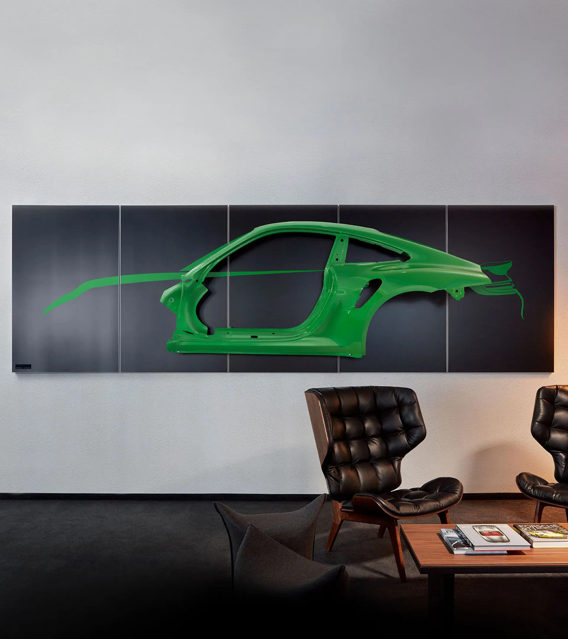 Die Faszination Porsche für zuhause: limitierte, individualisierbare Wandinstallation, bestehend aus einem originalen Karosserieteil des 911 Turbo [992]. Silhouette des 911 Turbo [992] mit hochwertiger Folie über gesamte Rückwand foliert. Seitenteil aus Aluminium, lackiert in einer von 17 Porsche Exterieurfarben. 5-teilige Aluminium-Rückwand, schwarz matt oder weiß matt lackiert, jeweils in silber-eloxiertem Aluminiumrahmen eingefasst. Limitiert auf 99 Stück weltweit.