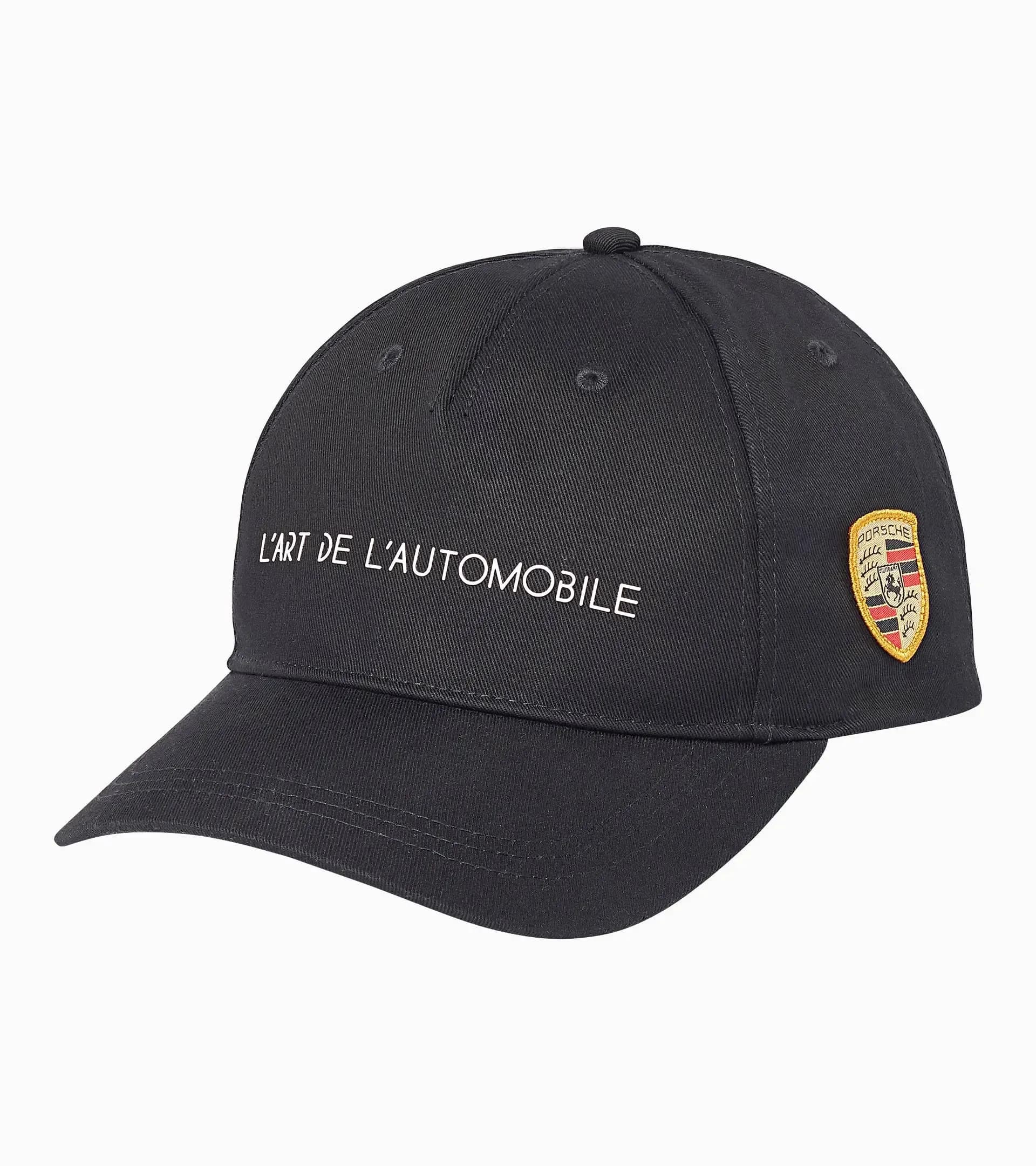 Ein echter Hingucker: die Cap aus der 968 L'ART Collection by L'Art De L'Automobile x Porsche mit aufgedruckten Logos und Wappen-Badge.