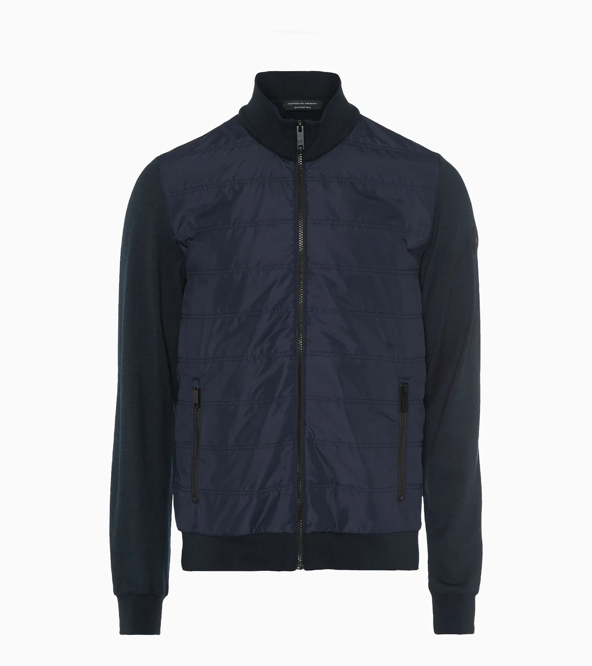 Hochwertiger Mix-Cardigan aus feinstem italienischem Stoff mit versteckten Reißverschlusstaschen. Made in Europe.