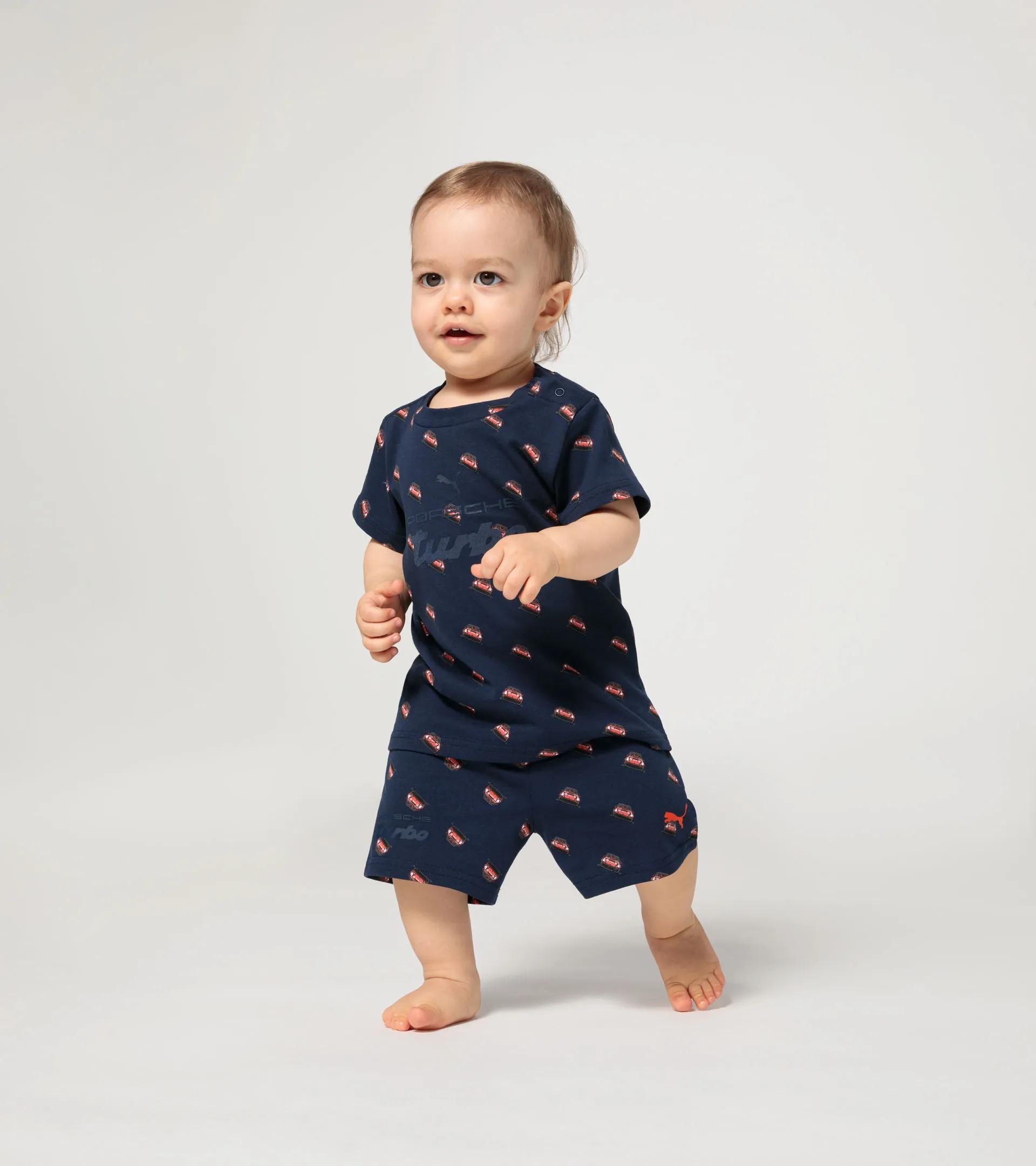 All-over-Print des 911 Turbo.Bestehend aus T-Shirt und Shorts.Druckknöpfe an den Schultern.Porsche Turbo Print auf der Brust.Stylisches 2er-Set für Kleinkinder.