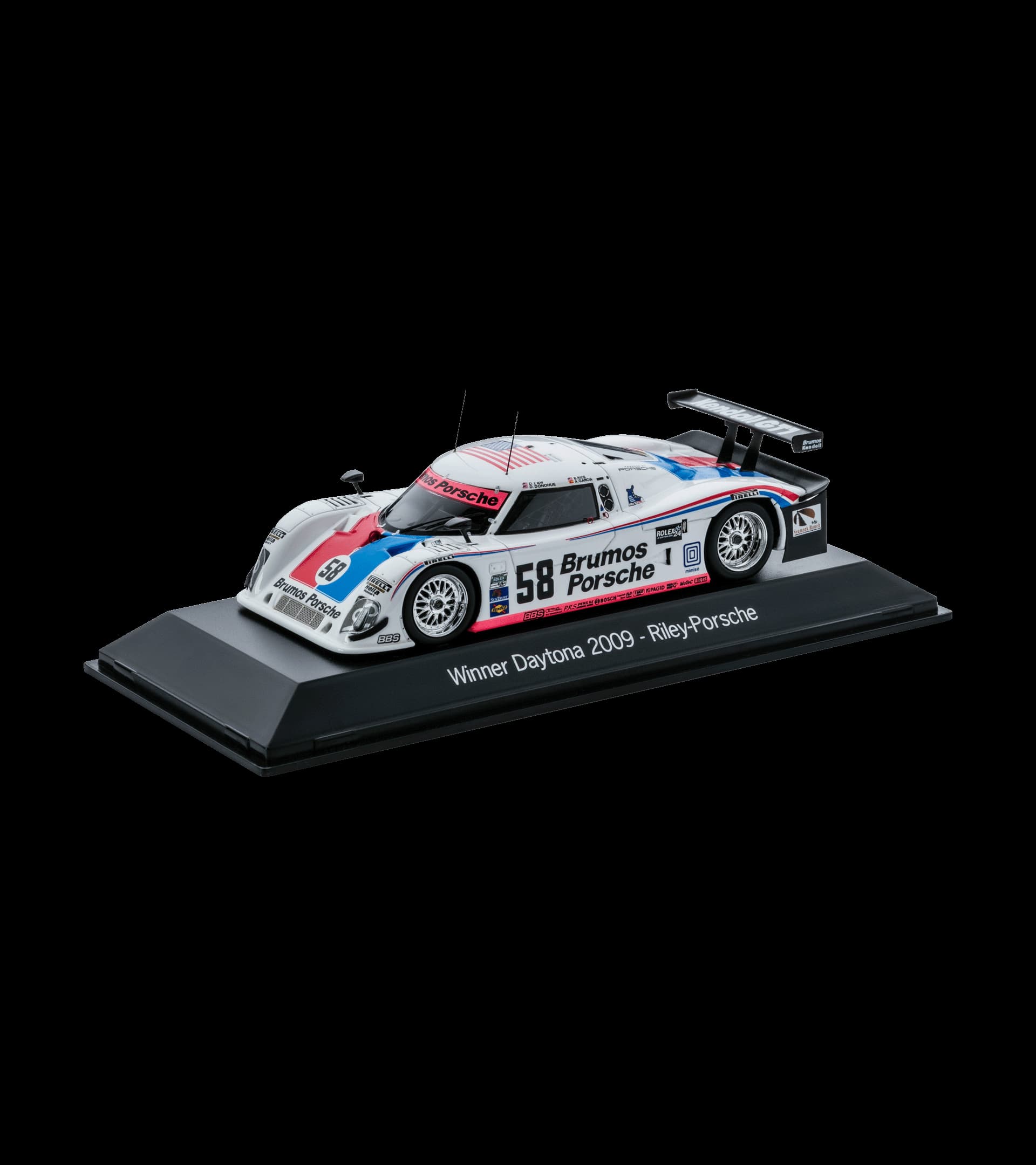 2009 gab es einen starken Auftakt für Porsche bei den 24 Stunden von Daytona: Pole-Position für den Riley-Porsche von Brumos Racing, mit nur einer Tausendstelsekunde Rückstand erreichte das Modell von Penske Racing den zweiten Platz. Zwei Porsche in der ersten Startreihe von Daytona – das hatte es zuletzt 1990 gegeben. Dieses Modell stellt das Siegerfahrzeug dar.
