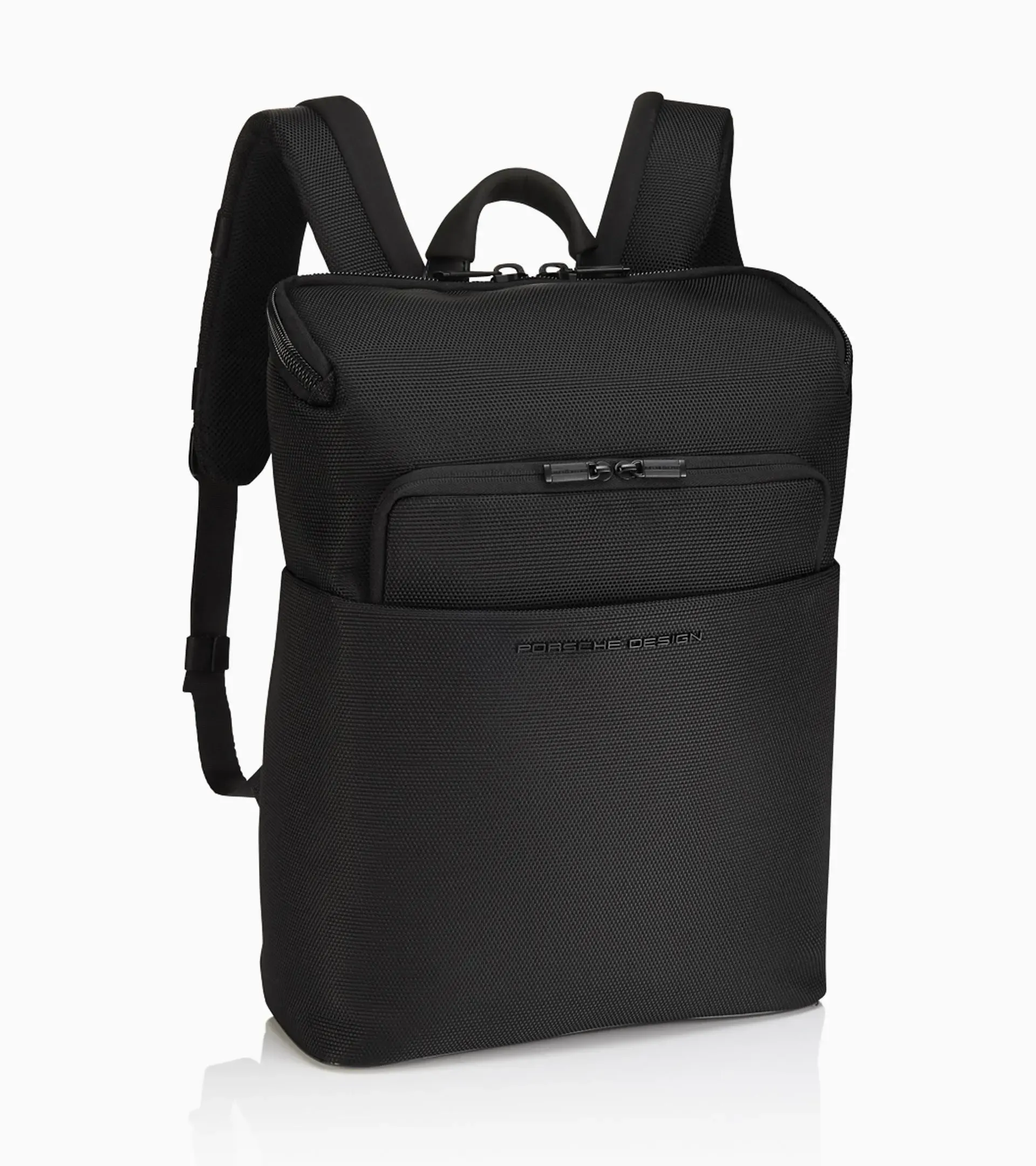 Die Rucksäcke der Reihe Porsche Design Roadster 4.0 sind dank innovativer, strapazierfähiger Materialien absolute High-Performance Produkte. Das 3D-strukturierte Nylon ist wasserabweisend und ausgesprochen widerstandsfähig. Das trotz seiner Maße geräumige Innenleben des SVZ bietet Stauraum für alle wichtigen Dinge des täglichen Bedarfs. Ordnung, Übersicht und bequemen Zugriff bieten die große Öffnung mit Zwei-Wege-Reißverschluss, das Frontfach mit Reißverschluss und der innenliegende Organizer mit gepolstertem Notebookfach. Für das Extra an Komfort sorgen gepolsterte Schultergurte, die sich ganz einfach auf die ideale Länge einstellen lassen, eine mit Neopren gepolsterte Griffschlaufe sowie ein gepolstertes Rückenteil mit Trolley-Link und Geheimfach mit Reißverschluss. Der bis ins Detail durchdachte Rucksack überzeugt zudem durch intelligente Extras wie eine große RFID-geschützte Innentasche und einen USB-Anschluss.