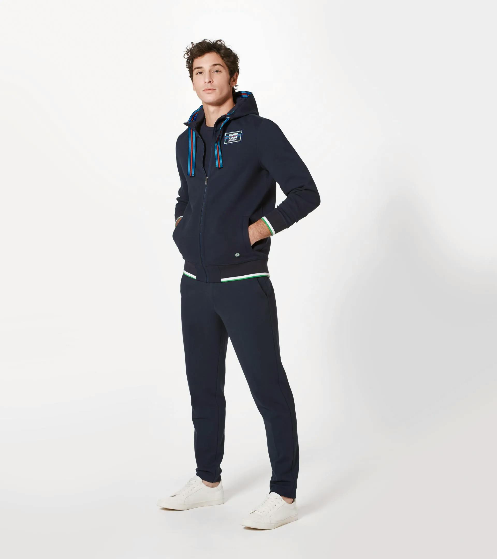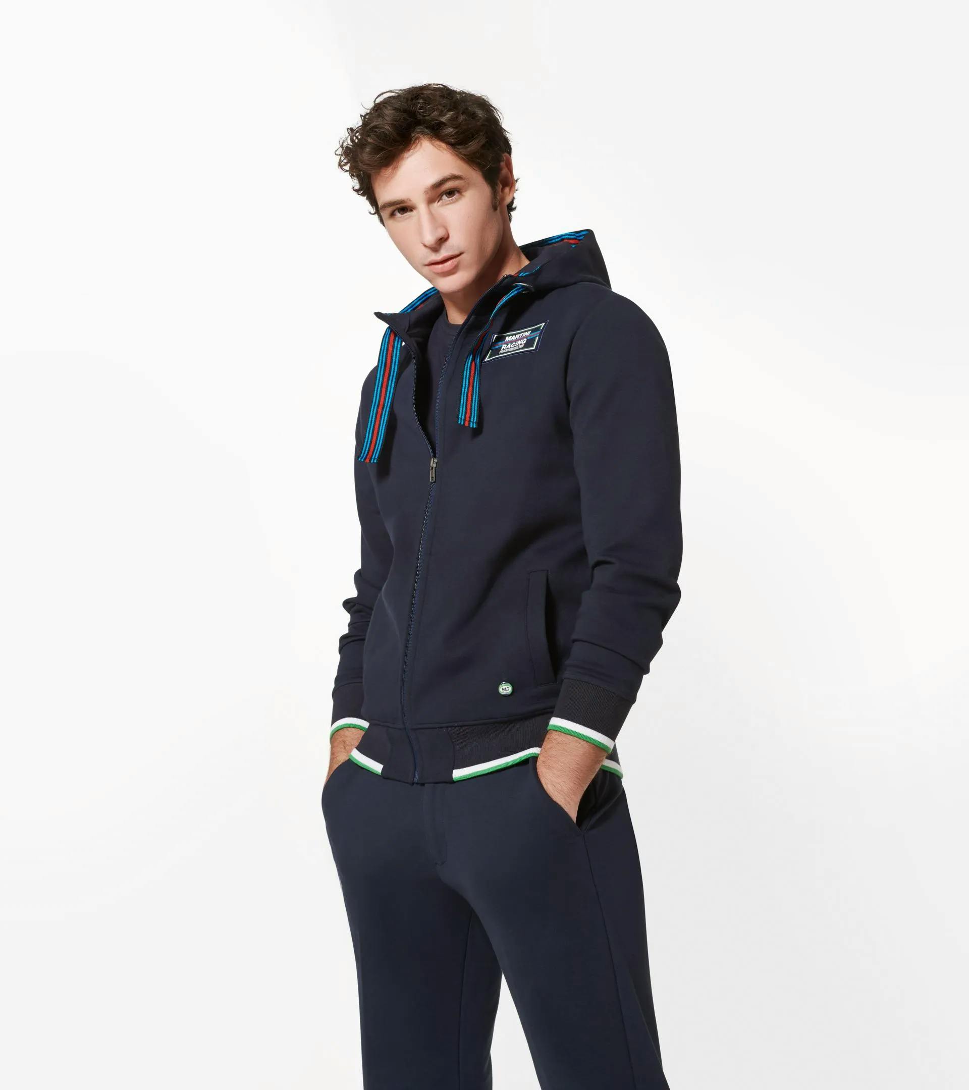 Sportliche Sweatjacke mit Kapuze und zwei Seitentaschen in Dunkelblau, mit Akzenten in den typischen „MARTINI RACING®“ Farben.
