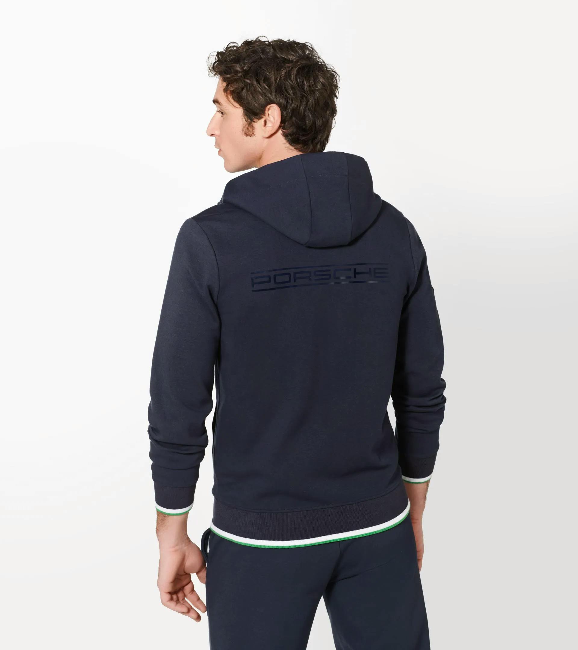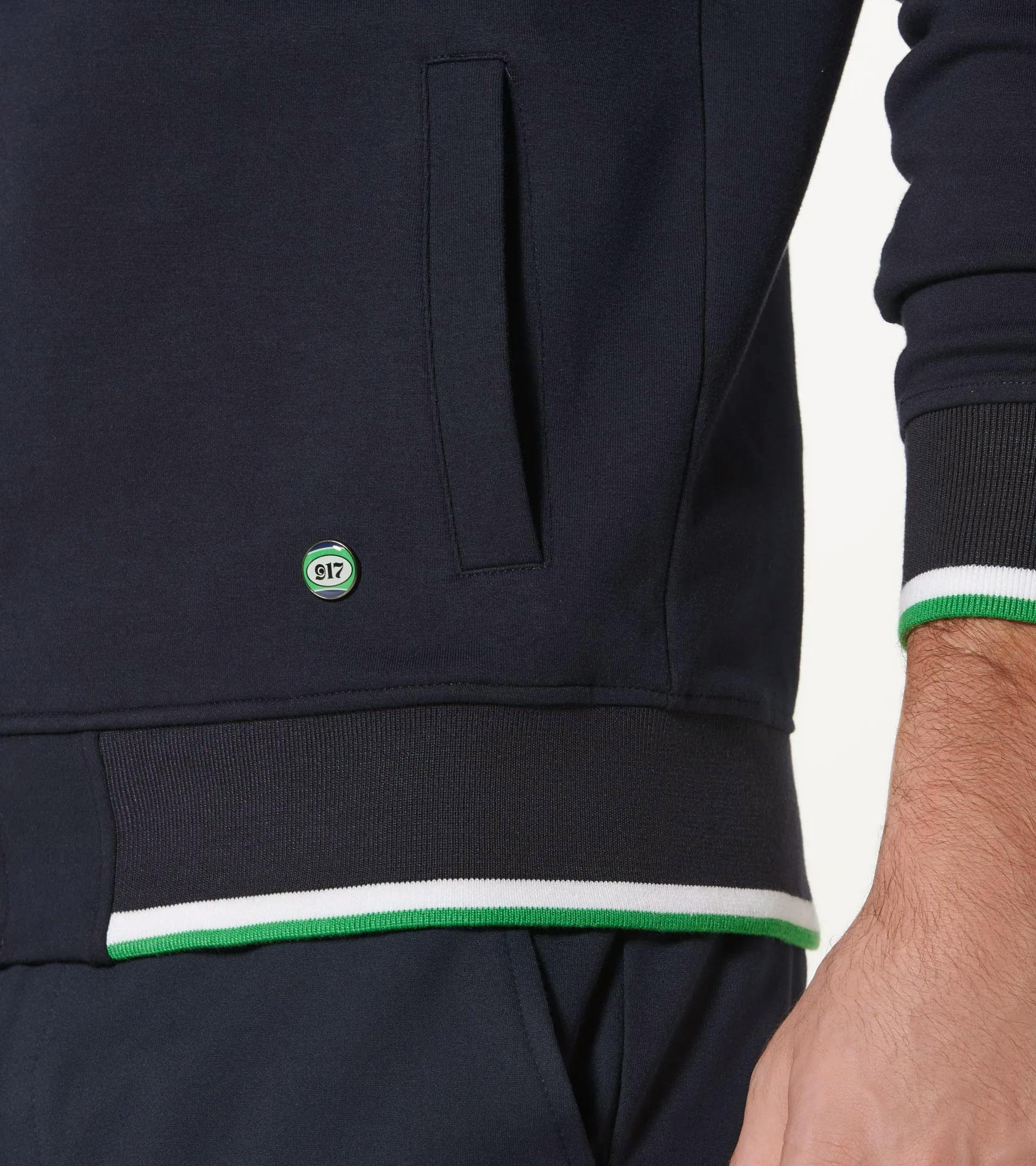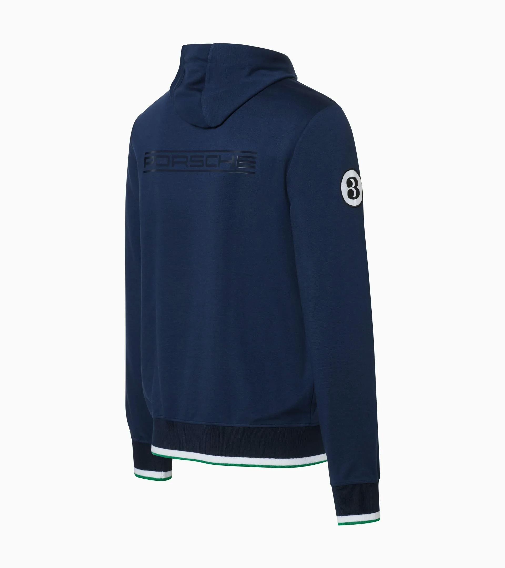 Sweatjacke mit Kapuze und zwei Seitentaschen in Dunkelblau, mit Porsche 917 „Hippie“ Farbakzenten in Blau/Grün. Kordeln und Saum an Kapuze in den typischen MARTINI RACING® Farben. „MARTINI RACING® PORSCHE“ Badge auf der Brust, Badge mit Ziffer 3 auf dem Oberarm und 917 Pin am Saum.