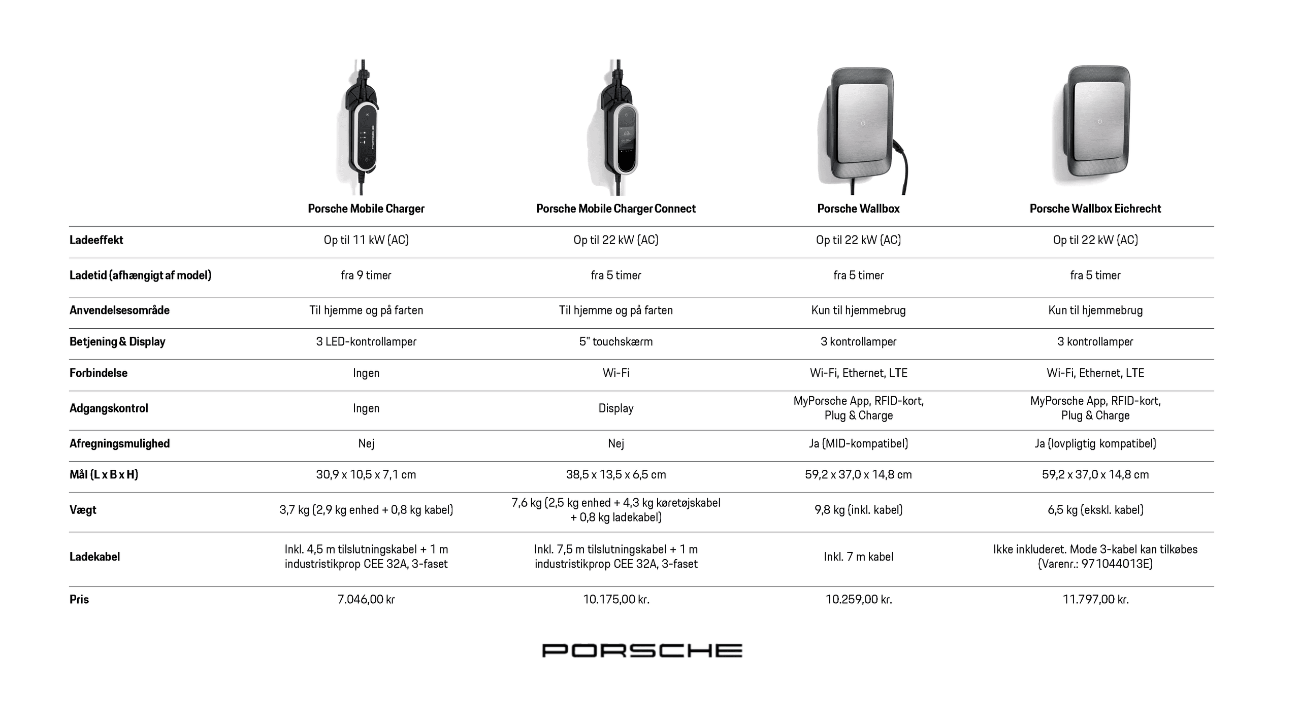 Oplev førsteklasses Porsche-udstyr til bekvem opladning af din fuldelektriske eller plug-in hybridmodel, både hjemme og på farten. Lær mere om vores innovative opladningsmuligheder, såsom Porsche Wallbox, Porsche Wallbox (kalibreringskompatible), Mobile Charger og Mobile Charger Connect.