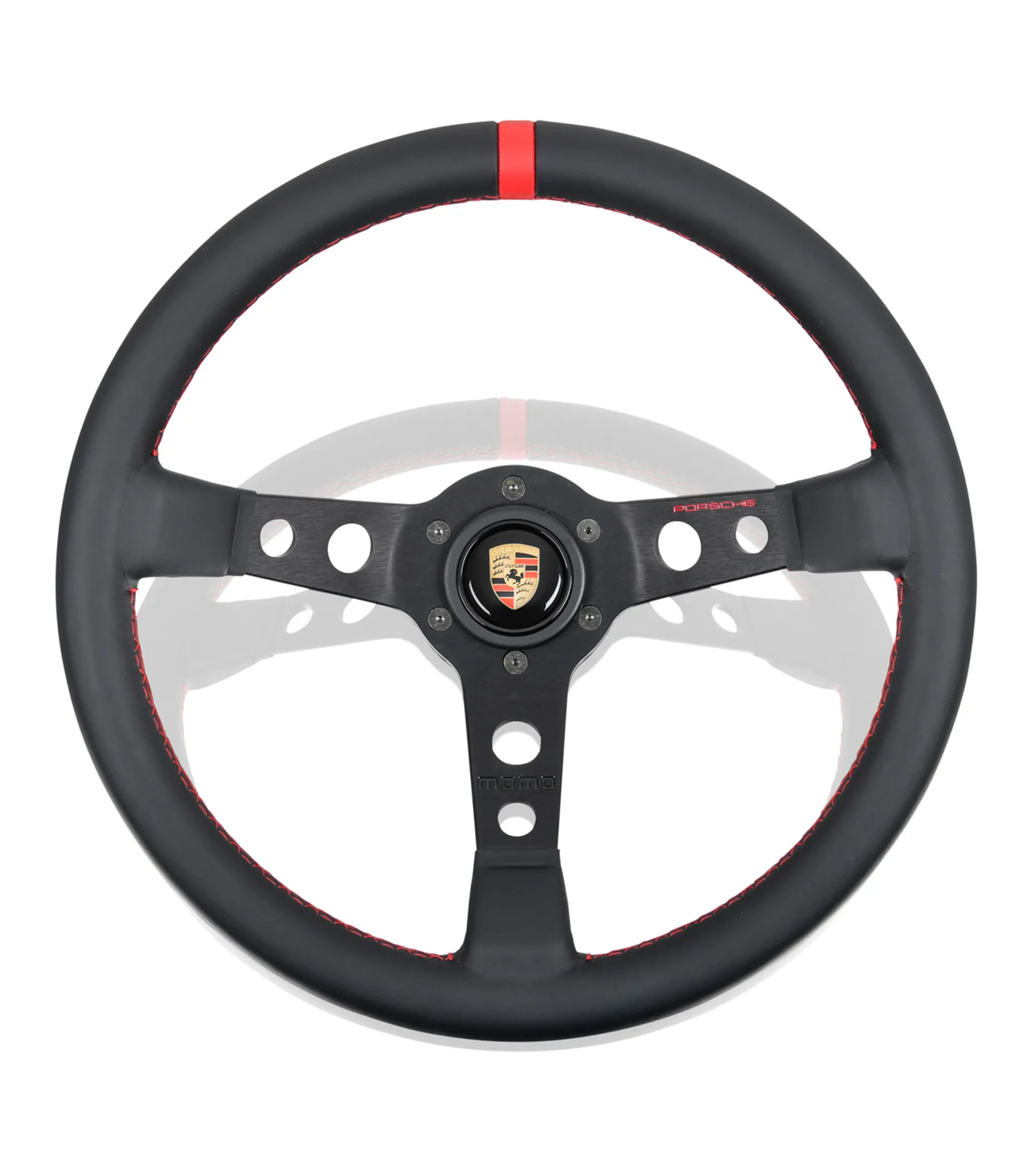 Med Porsche Classic Performance-rattet får dit køretøj Porsches umiskendelige sportslook. Dette 3-egers sportsrat i høj kvalitet er udviklet i samarbejde med Momo og imponerer med sin førsteklasses ergonomi og sit tidløse design. Hornknappen er prydet af det historiske Porsche-våbenskjold, mens det sorte glatte læder og de røde Porsche-bogstaver understreger det ikoniske udseende.