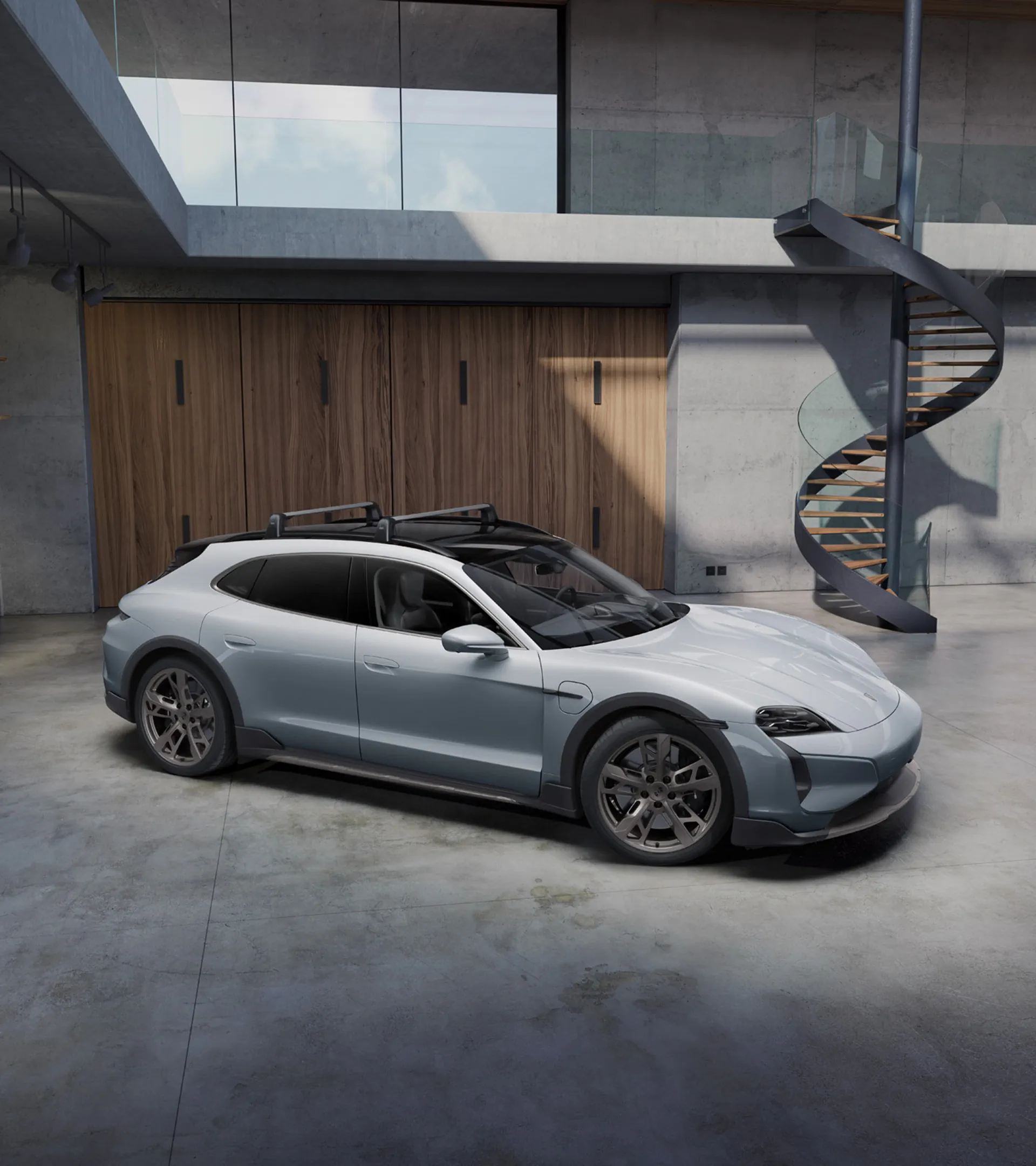 2 låsbare tværdragere af aluminium. Den maksimale belastning på taget er 75 kg. Beregnet til Porsche Tequipment-transportudstyr.