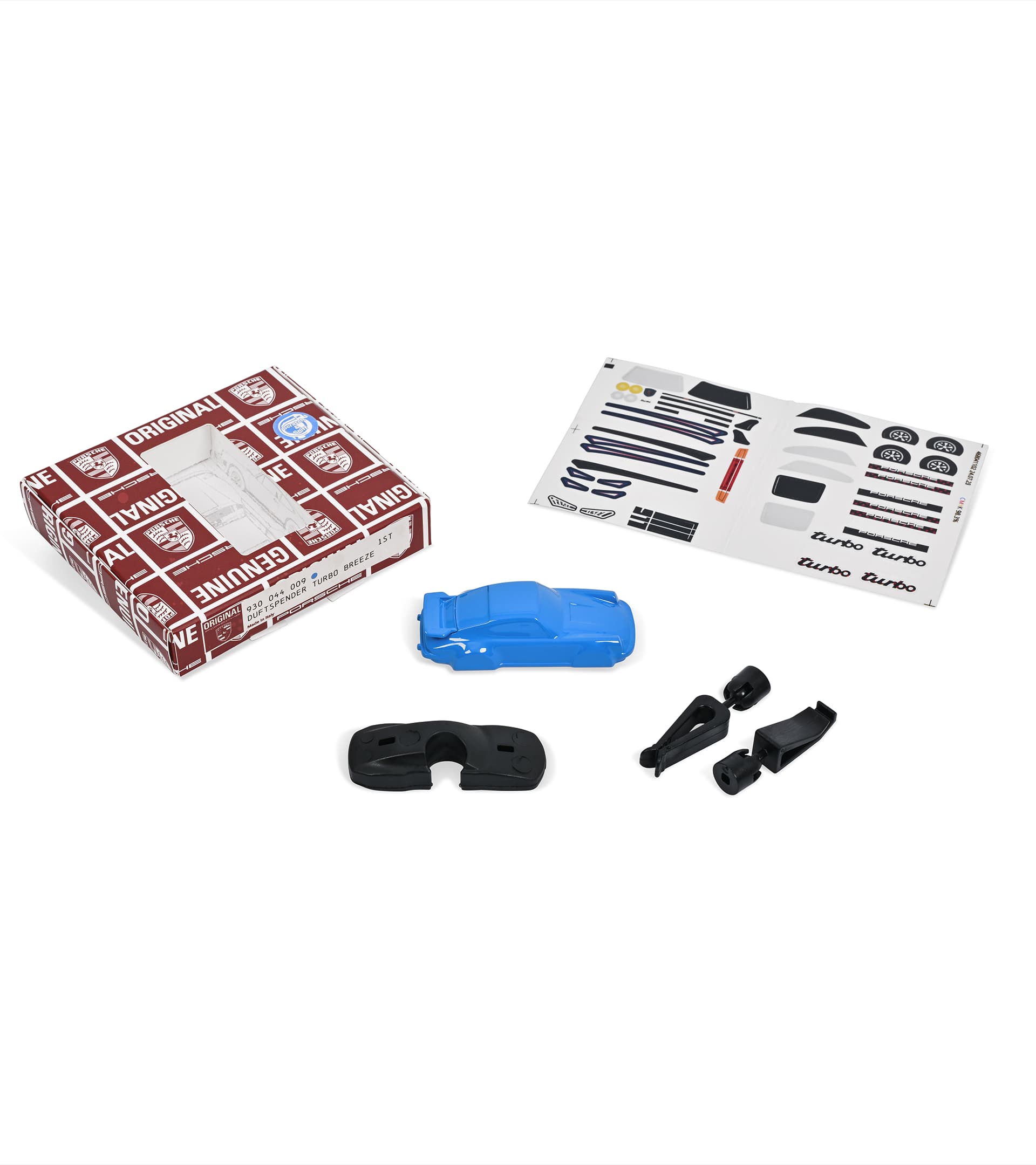 Duftdispenseren "Turbo Breeze" i et klassisk design er en forfriskende kombination af blomster, eukalyptus, citron og cedertræ, der skaber en subtil og sødlig duft i bilens interiør. Selve duftdispenseren skinner i lakfarven "Mexico Blue", der engang var tilgængelig til 911 Turbo. Sættet indeholder også et klæbesæt i original udførelse, der afspejler den daværende tids autenticitet og charme.