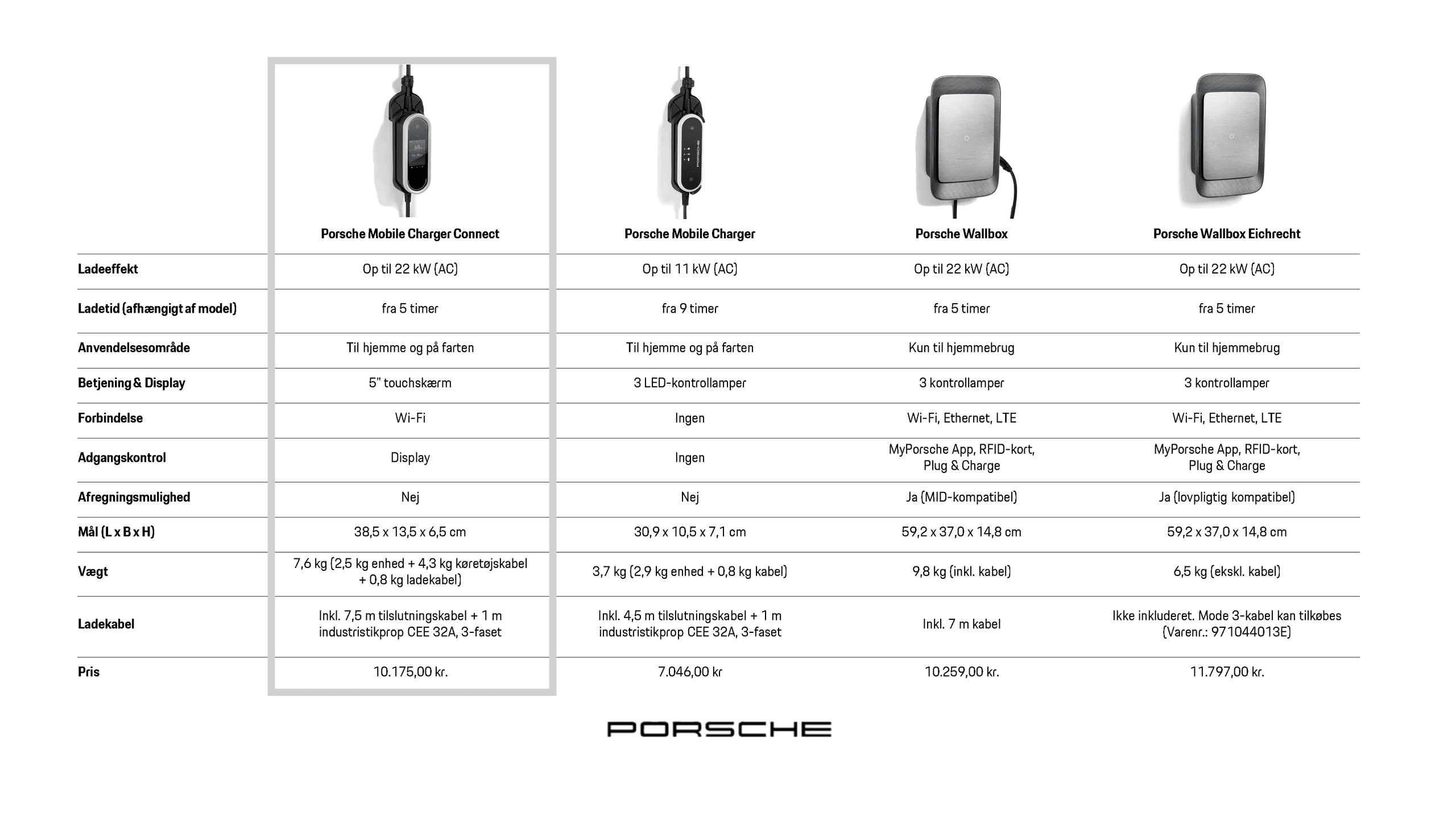 Porsche Mobile Charger Connect er en oplader med 5-tommers touchdisplay, som du kan tilslutte til dit industri- eller husholdningsstik. Den mobile opladningsløsning behøver ikke at være med fast kabel. Den har en effekt på op til 22 kW (AC). Opladeren kan konfigureres og betjenes via WLAN og kan om nødvendigt fastgøres til garagevæggen derhjemme ved hjælp af et vægbeslag, der fås som tilbehør.