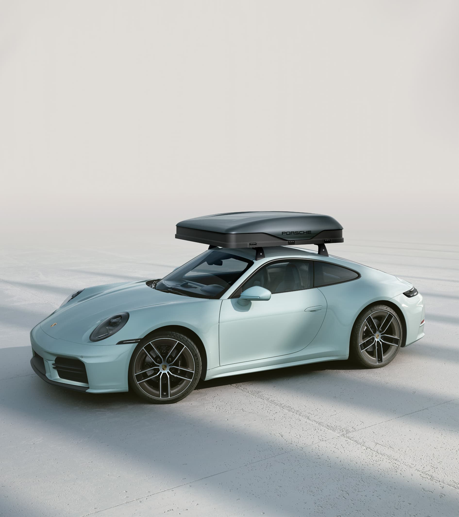 Hardcase-boksen, der er konstrueret i udviklingscentret i Weissach, fås i farvekombinationen sort/lysegrå eller sort/mørkegrå. Den er designet af Studio F.A. Porsche i Zell am See og er forsynet med det markante, matsorte "PORSCHE"-påtryk på begge sider. Helårsteltet består af et åndbart stof i en bomuldsblanding, vandtætte lynlåse og et ekstra regnslag til adgangsåbningen. Et særligt blikfang er sidevæggene. De gengiver den legendariske flyline fra 911 og er også forsynet med "PORSCHE"-påtryk. Også teltets indre har nogle højdepunkter at byde på, for eksempel den velisolerende, quiltede foring i lysegrå med en påtrykt bjergsilhuet i hovedenden. Quiltningsmønsteret gentages på den indbyggede, komfortable high-density polyfoam-madras.