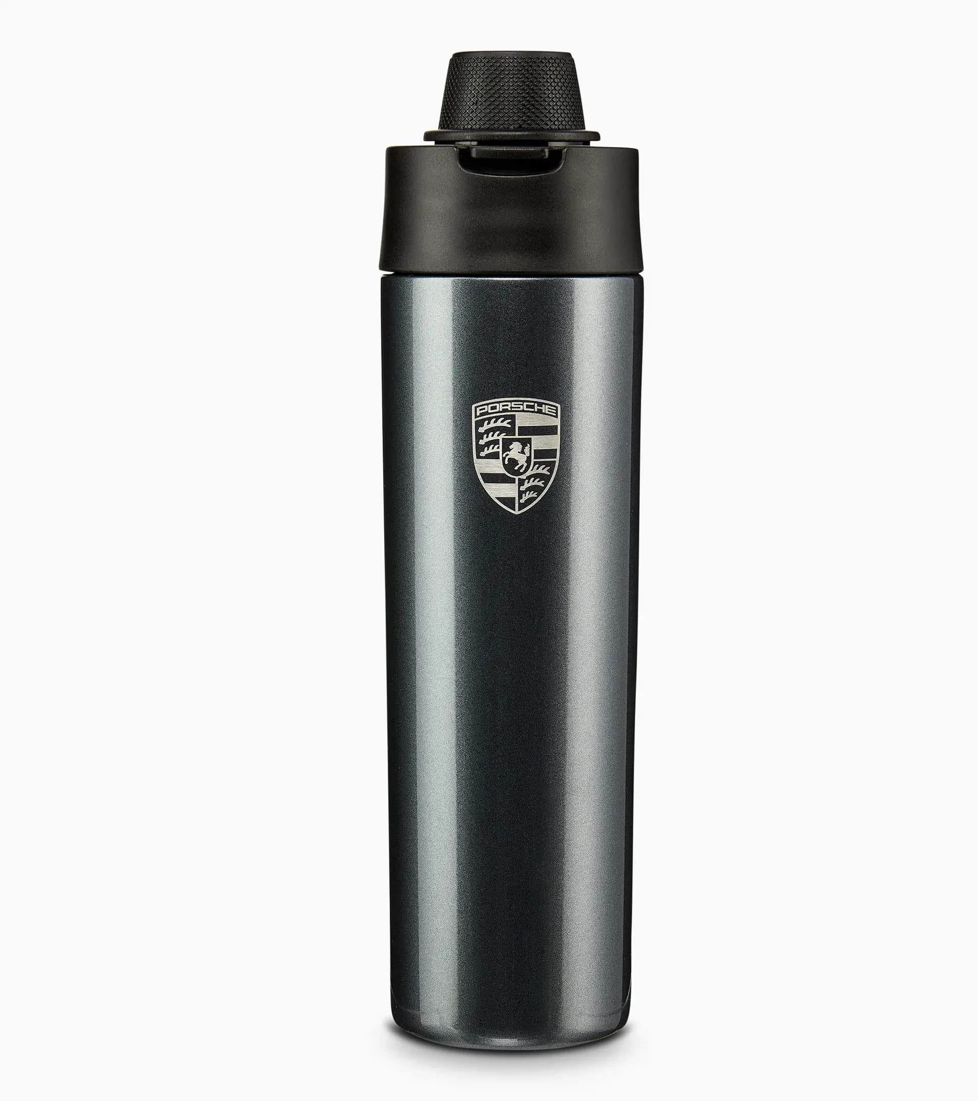 For long journeys or daily use, this stylish drinking bottle keeps your drink at a steady temperature. Made of double-walled stainless steel, carefully painted and adorned with a laser-engraved Porsche Crest, it is both stylish and functional. The lid is particularly striking, with a design reminiscent of the Drive Mode button on a Porsche steering wheel and featuring embossed Porsche lettering.