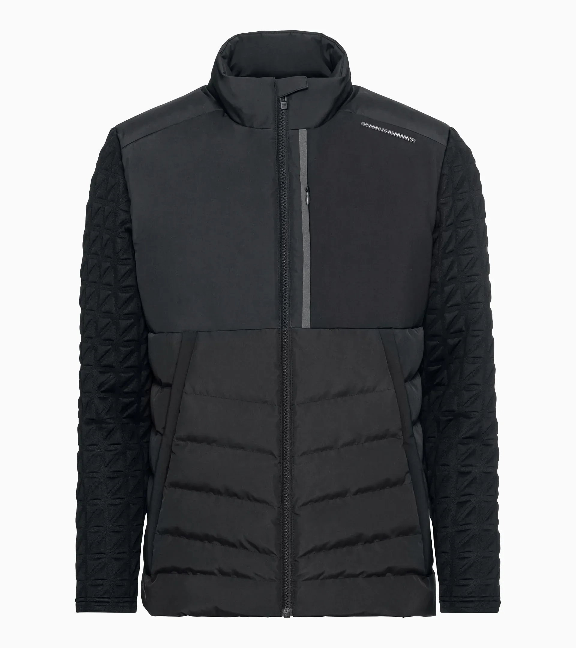 Cutting-edge in look and functionality, but extremely comfortable: thanks to its mix of materials and technical design, the Porsche Design Light Insulated Jacket is an all-round sports staple. Quilted sections are combined with CORDURA® fabric and knitted sleeves made of JACQ2K. The three-dimensional jacquard knit was developed exclusively for Porsche Design and highlights the unique technical character of the jacket. Chest and back panels made of CORDURA®, an abrasion-resistant fabric made from recycled polyamide, accentuate the jacket's shape and also increase its durability. Beneath the graphic top layer on the front and back lies REPREVE® padding – as soft and warm as down, but made from recycled PET. The front zipper, with a mesh insert and second zipper, allows you to adjust the fit and ventilation as needed. The hidden double pocket design – an upper open pocket with warm fleece lining for your hands, plus a spacious lower pocket with a zipper – and reflective details complete the smart design. This is bound to become an everyday favorite.