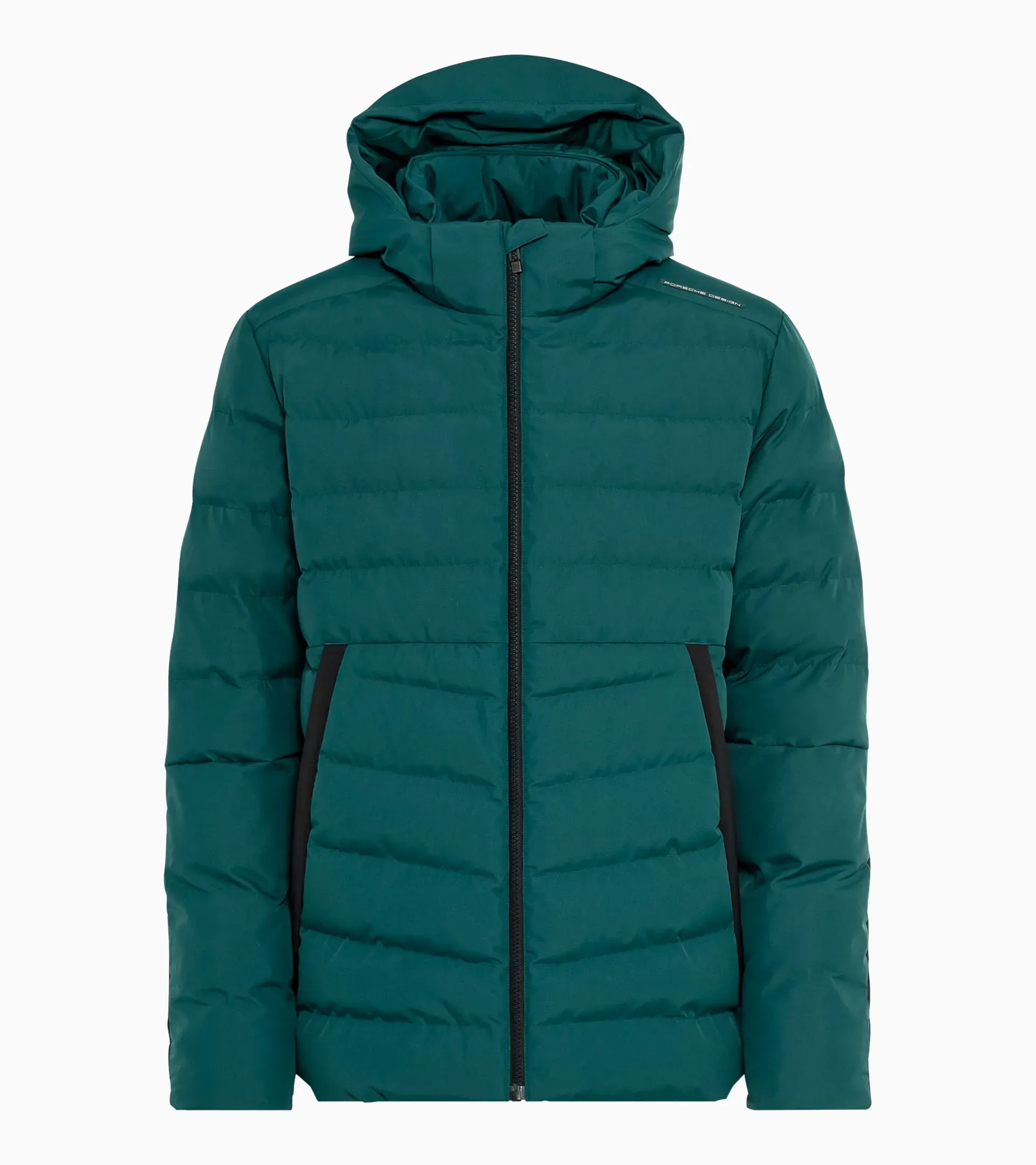 Sports-inspired style meets smart design: the Porsche Design Padded Jacket boasts a technical design and ingenious reflective details. The high-quality outer fabric is water-repellent and windproof, while sustainable CORDURA® inserts on the back and sleeves set accents and boost the jacket's durability. Under the dynamic quilted front lies padding with REPREVE® fibers – as soft and warm as down, but made from 100% recycled PET. The front zipper, with a mesh insert and second zipper, allows you to adjust the fit and ventilation of the jacket as needed. On both sides, the diagonal bar hides a double pocket: an upper open pocket with warm fleece lining for your hands, and a spacious lower pocket with a zipper. To complete the exclusive comfort concept, the parka has a detachable hood with attached visor, and two inside pockets.