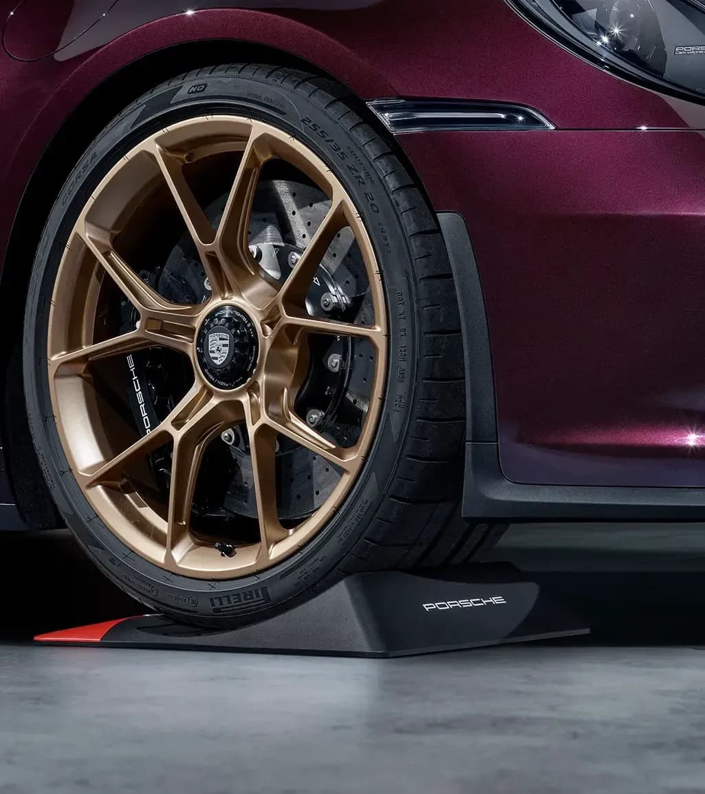 For the most stylish way of positioning your own Porsche in the garage: the ParkDistance pads, designed by Studio F. A. Porsche in Zell am See, feature a red-white curb design based on race tracks and a “PORSCHE” logo on the back.