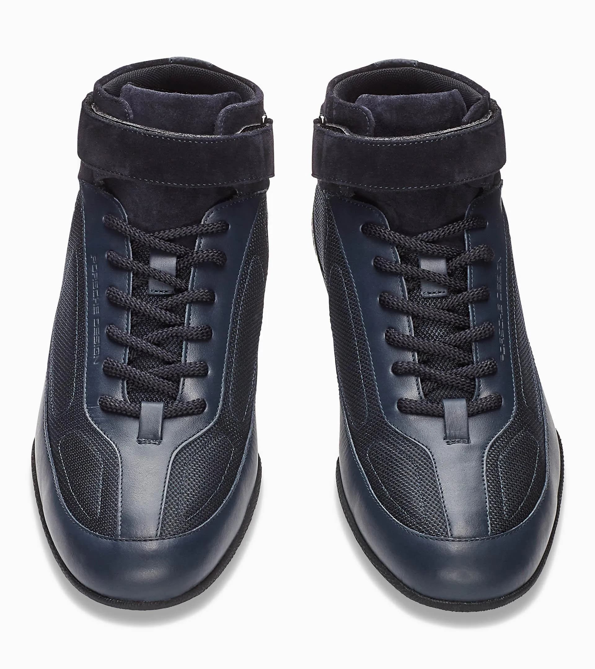 The Porsche Design Racer High Top: a traditional racing driver's shoe with a contemporary look and feel. With its slim silhouette and iconic design, the sneaker follows the long and successful tradition of Porsche Motorsport. The combination of technical mesh, high-quality leather and carbon leather in the heel maximizes the dynamic look of this men's shoe. An optimally shaped non-slip sole with raised heel provides good grip while the oblique angled shaft ensures maximum freedom of movement on the gas pedal. Also typical to Porsche Design, the leather Velcro flap closure is functional and not only a style feature. Namely, it provides additional ankle support. A shoe couldn't be more like a sports car.