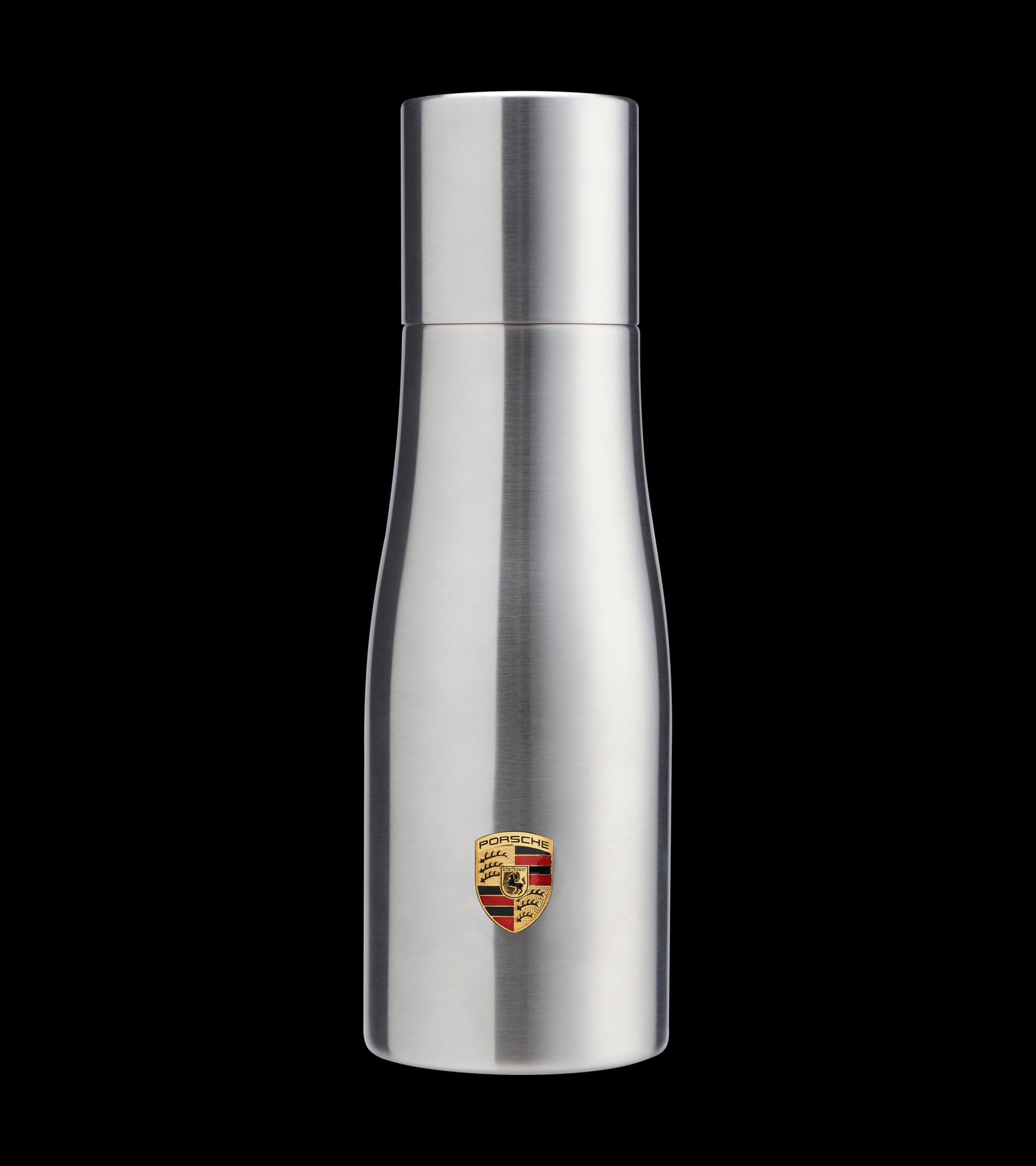 De acero inoxidable de doble pared. Con el logotipo Porsche destacado y un cierre que imita a la fijación central de llantas Porsche.