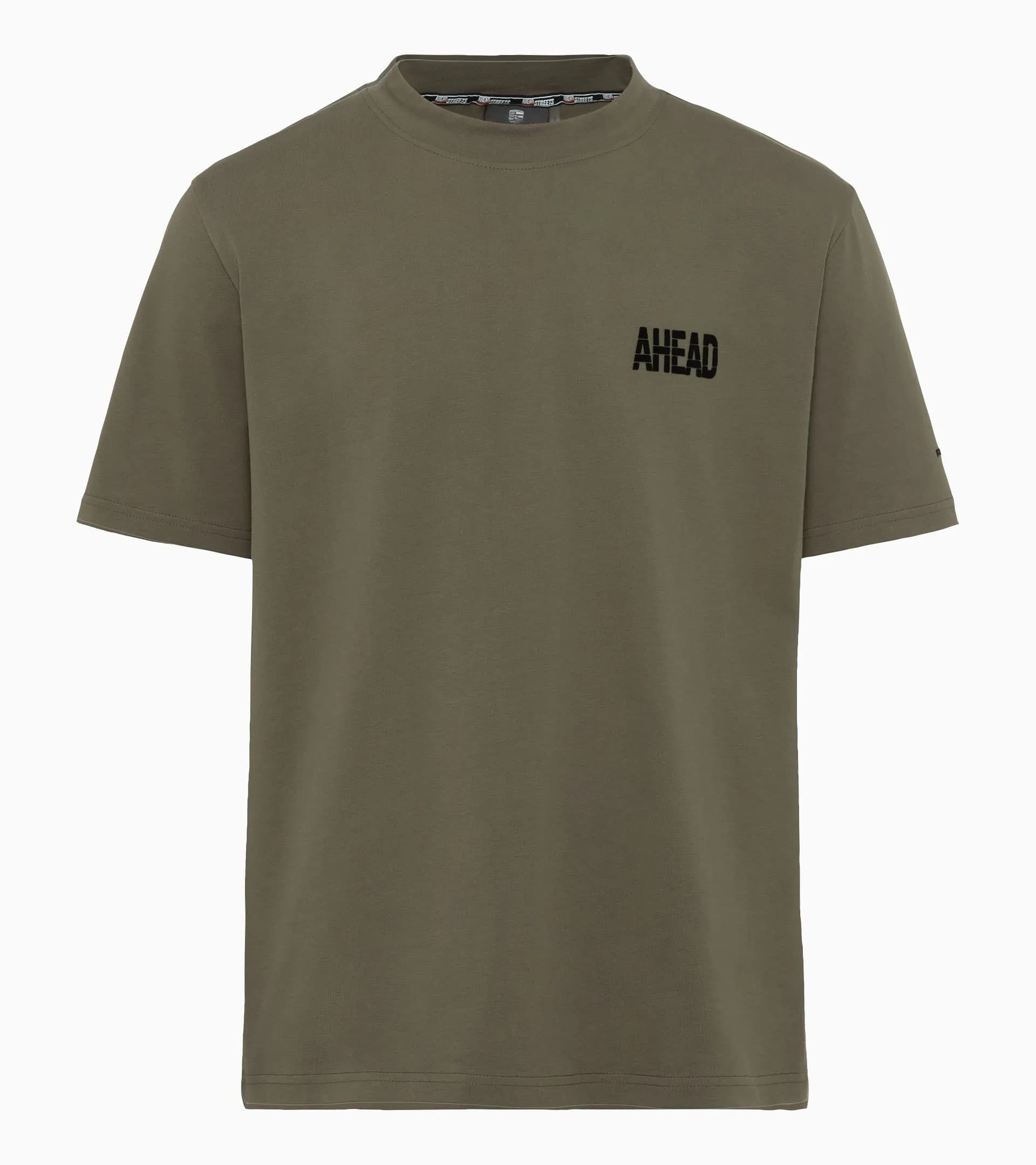 El viaje por carretera se encuentra con el estilo de vida: la colección AHEAD combina espíritu pionero y espíritu aventurero con un diseño icónico. Esta camiseta confeccionada con algodón de alta calidad presenta un cuello ancho y un corte ligeramente cuadrado y holgado. Los anagramas «AHEAD» y «Porsche» en el lado izquierdo del pecho y en la manga izquierda añaden un toque especial. Un gran estampado que combina serigrafía y flocado en la parte trasera completa el diseño.