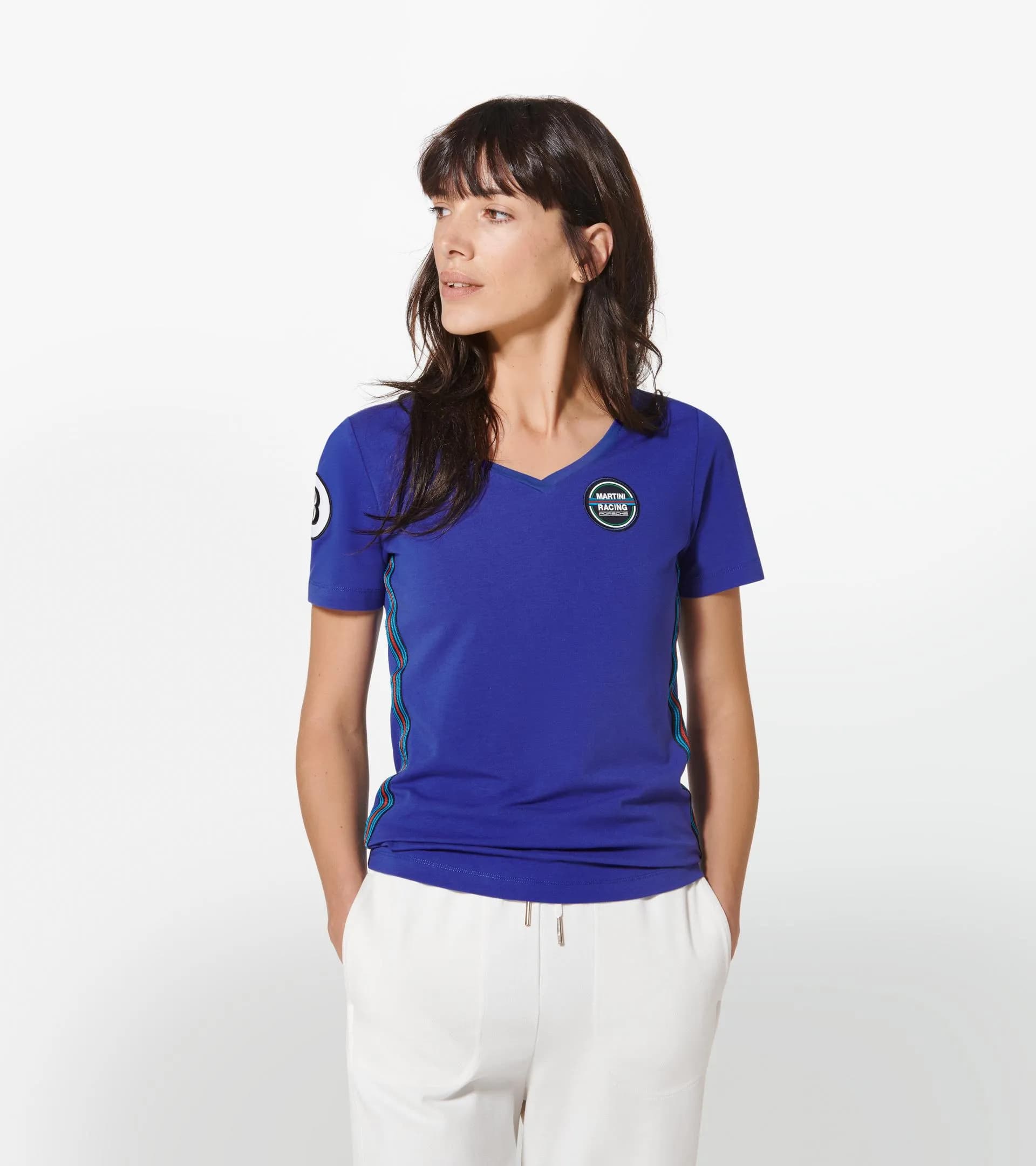 Camiseta de manga corta con cuello femenino en pico con insignia «MARTINI RACING® PORSCHE» y anagrama «PORSCHE» estampado en la espalda.