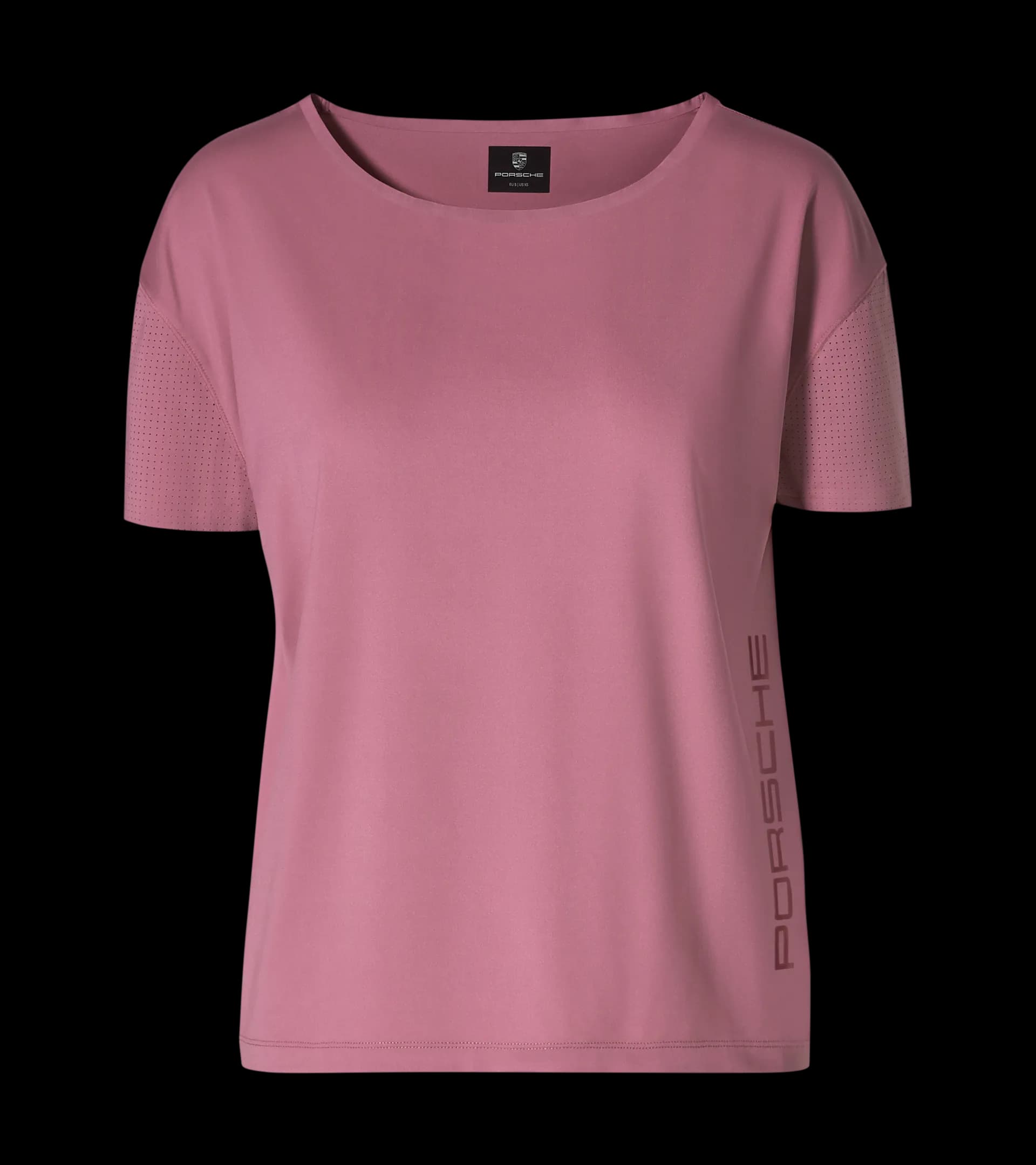Camiseta de manga corta de corte suelto con mangas perforadas y escote ancho. Transpirable y de secado rápido. Gran estampado con alto brillo y transparente con anagrama «PORSCHE».