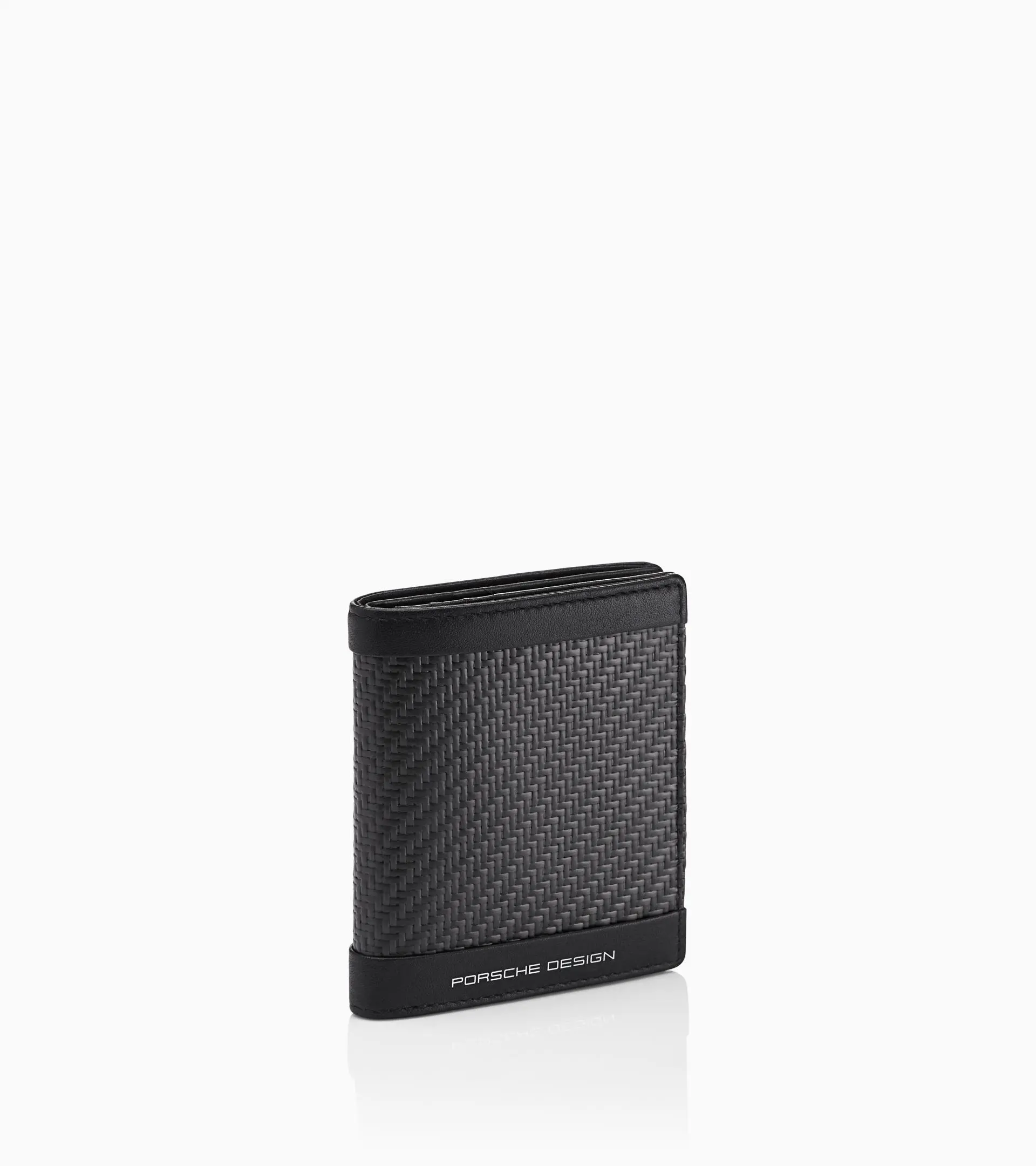 Pequeña billetera para hombre en tejido de carbono y cuero de Porsche Design. La cartera dispone un compartimento para monedas, bolsillo, seis ranuras para tarjetas de crédito y dos compartimentos.