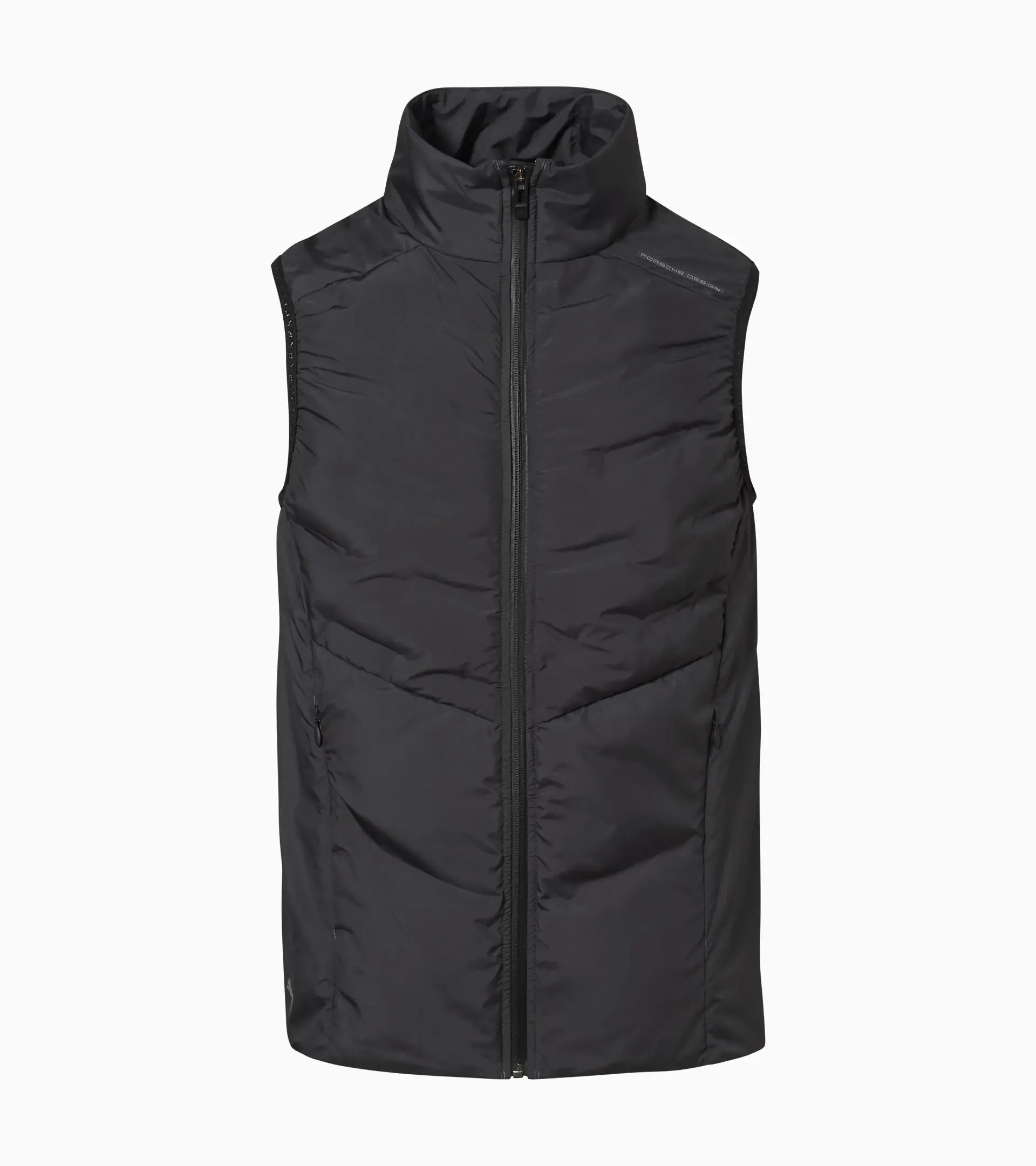 El estampado: único. La confección: exclusiva. Los materiales: innovadores. El chaleco Porsche Design Functional Vest combina el acabado técnico más moderno con el diseño más exclusivo. El acolchado de la ligera chaqueta de caballero se adhiere a un diseño desarrollado exclusivamente para Porsche Design, conformando así un estampado gráfico singular. El diseño deportivo se completa con el material exterior ligeramente brillante con estampado de efecto orgánico, puños con ribete elástico Porsche Design X PUMA y dos bolsillos interiores acentuados con colores de señalización, uno de los cuales con un clip para llaves. Sin embargo, el auténtico rendimiento se encuentra en el interior de la chaqueta pespunteada: el ligero acolchado de fibras de Ecodown®. Cálida y voluminosa, como el plumón auténtico, pero al 100 % de botellas de plástico PET recicladas y, de este modo, respetuosa con el medio ambiente y con los animales. Un chaleco impoluto en todos los sentidos.