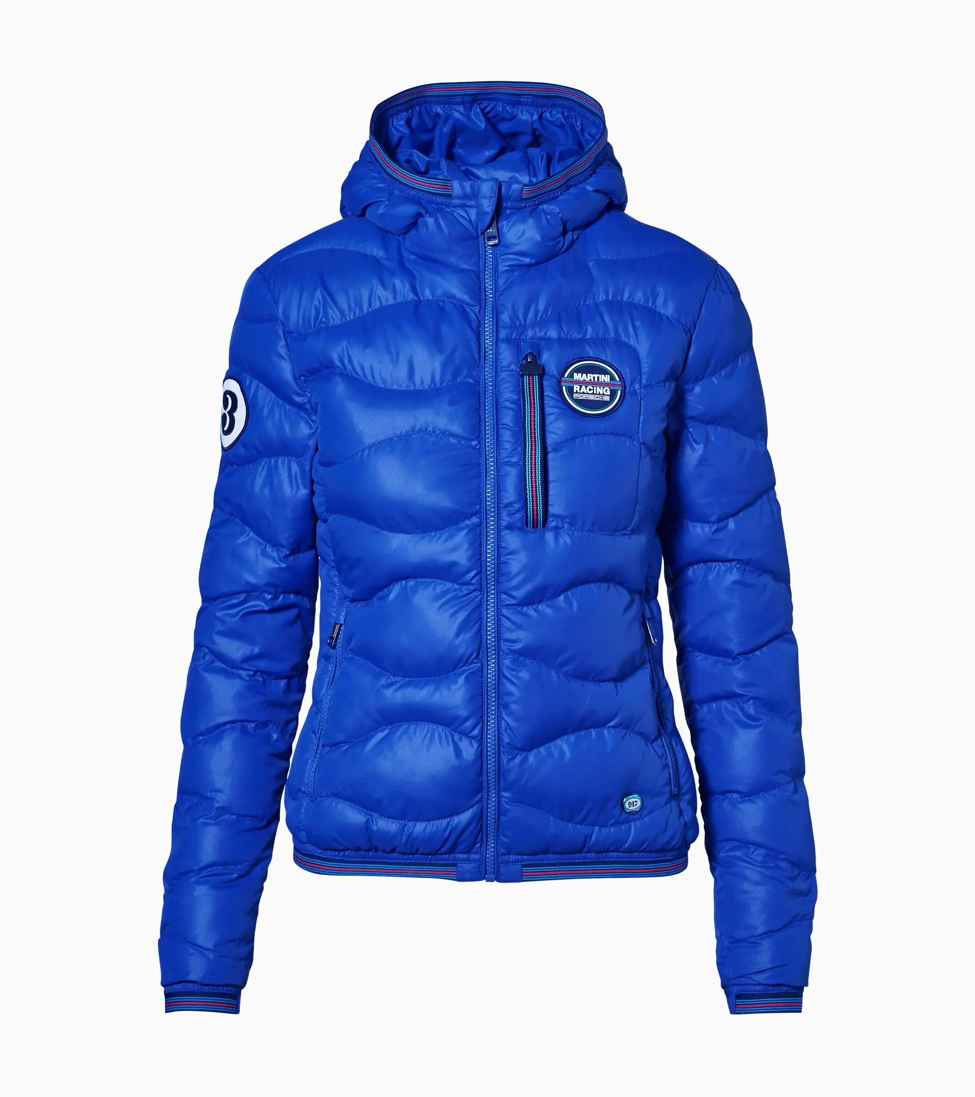 Moderna chaqueta pespunteada ligeramente acolchada, reversible y con capucha. Con bolsillo en la pechera y dos bolsillos laterales. Impermeable y cortavientos. Con motivos en los colores característicos de MARTINI RACING®. Insignia «MARTINI RACING® PORSCHE» en la pechera, insignia con el número 3 en la parte superior de la manga y pin 917 en el dobladillo. La cara interior está inspirada en el Porsche 917 «Hippie».