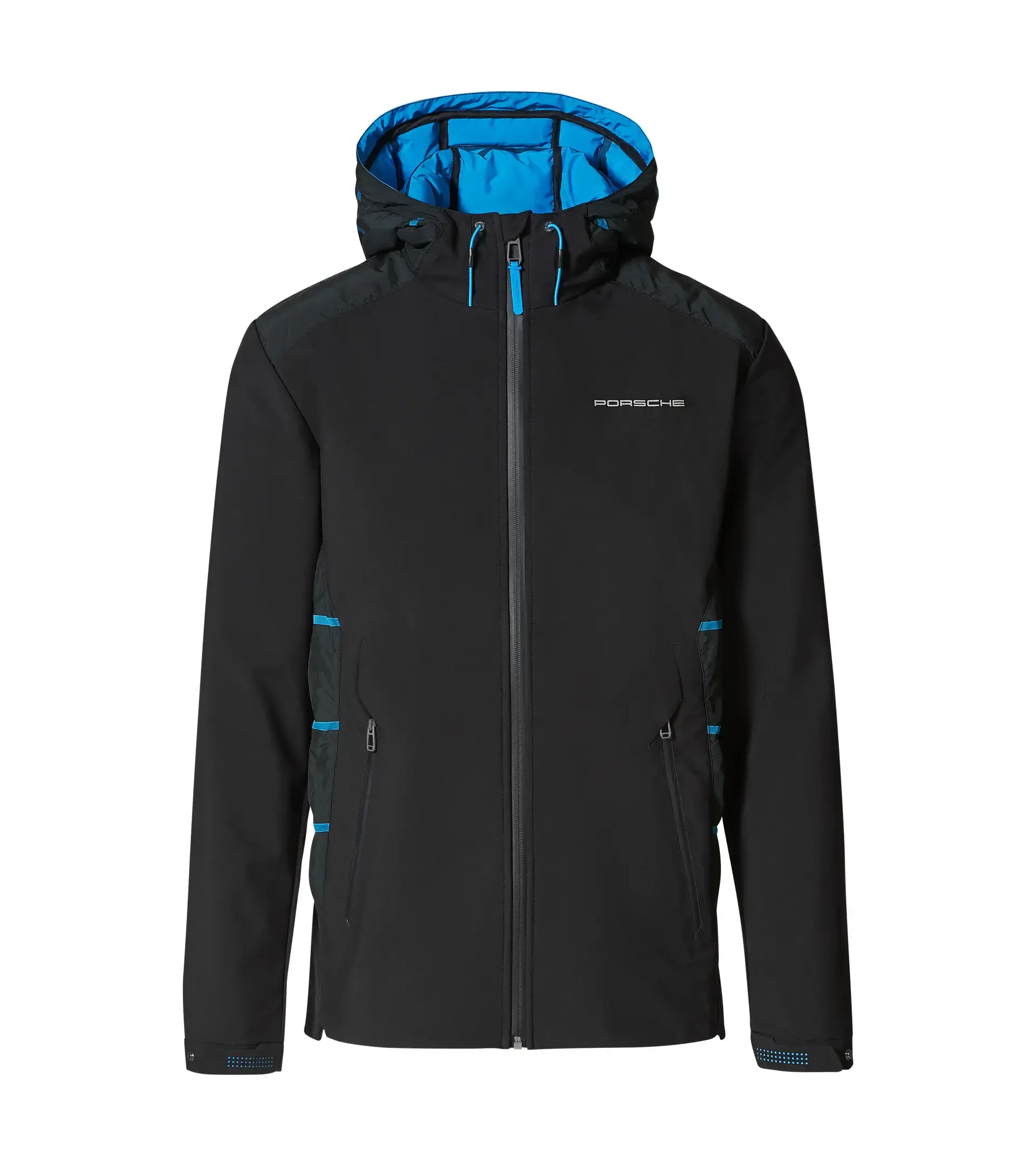 Chaqueta acolchada con capucha. Columna de agua de 3.000 mm [presión de agua en milímetro que soporta el material exterior antes de que penetre el agua] y transpirabilidad de 3.000 g/m²/24h [cantidad de líquido evaporado en gramos por metro cúbico en 24 horas]. Parte delantera, mangas y dobladillo de la espalda de tejido hardshell con interior de forro polar. Capucha, hombros, espalda y laterales con cámaras acolchadas en tejido de contraste. Con bolsillos laterales cortados por láser con cierre de cremallera. Puños de las mangas con botones automáticos ocultos. Elementos decorativos: anagrama «PORSCHE» reflectante en la pechera y perforaciones en los puños de las mangas.