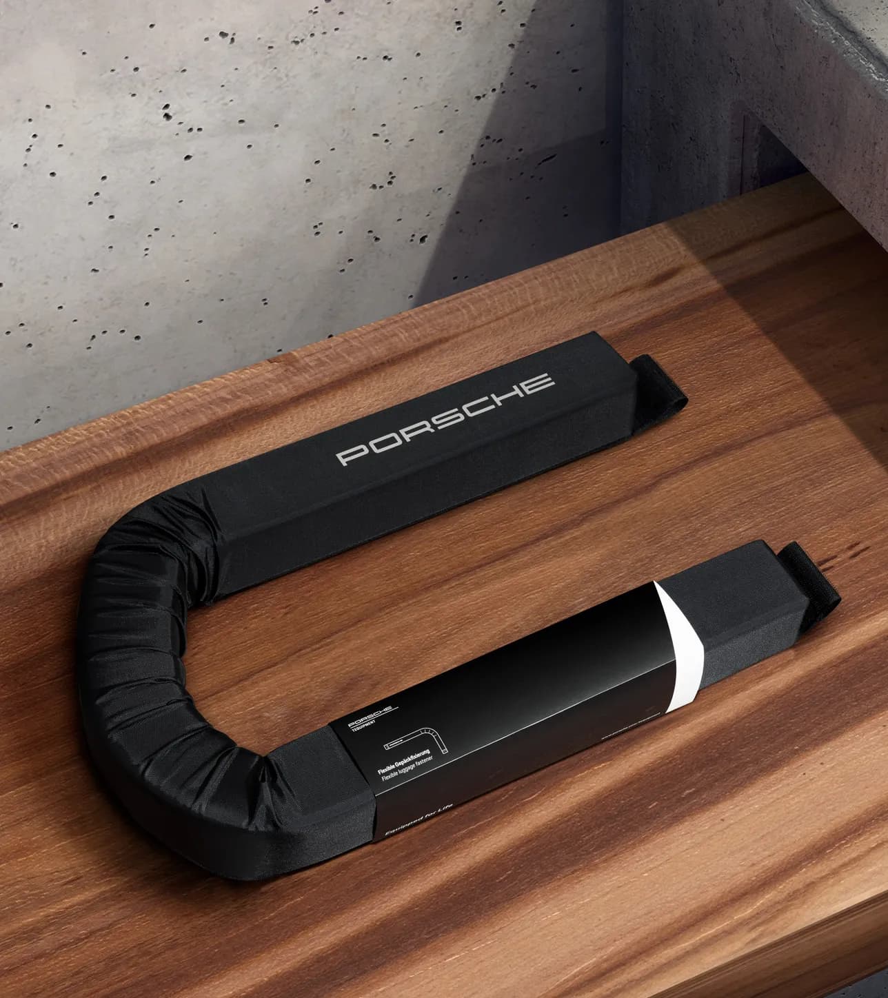 La fijación de equipajes flexible de Porsche está hecha de gomaespuma moldeable recubierta de nylon resistente a la humedad y a la suciedad en el exterior. En la parte inferior hay una capa de velcro que se adhiere a la moqueta de forma tan firme que los objetos no se mueven. En ambos extremos hay grandes lazos de velcro. Con su ayuda, el cierre de velcro se puede soltar sin problemas. Todo ello hace que la fijación de equipajes flexible de Porsche sea una ayuda muy versátil para el día a día.
