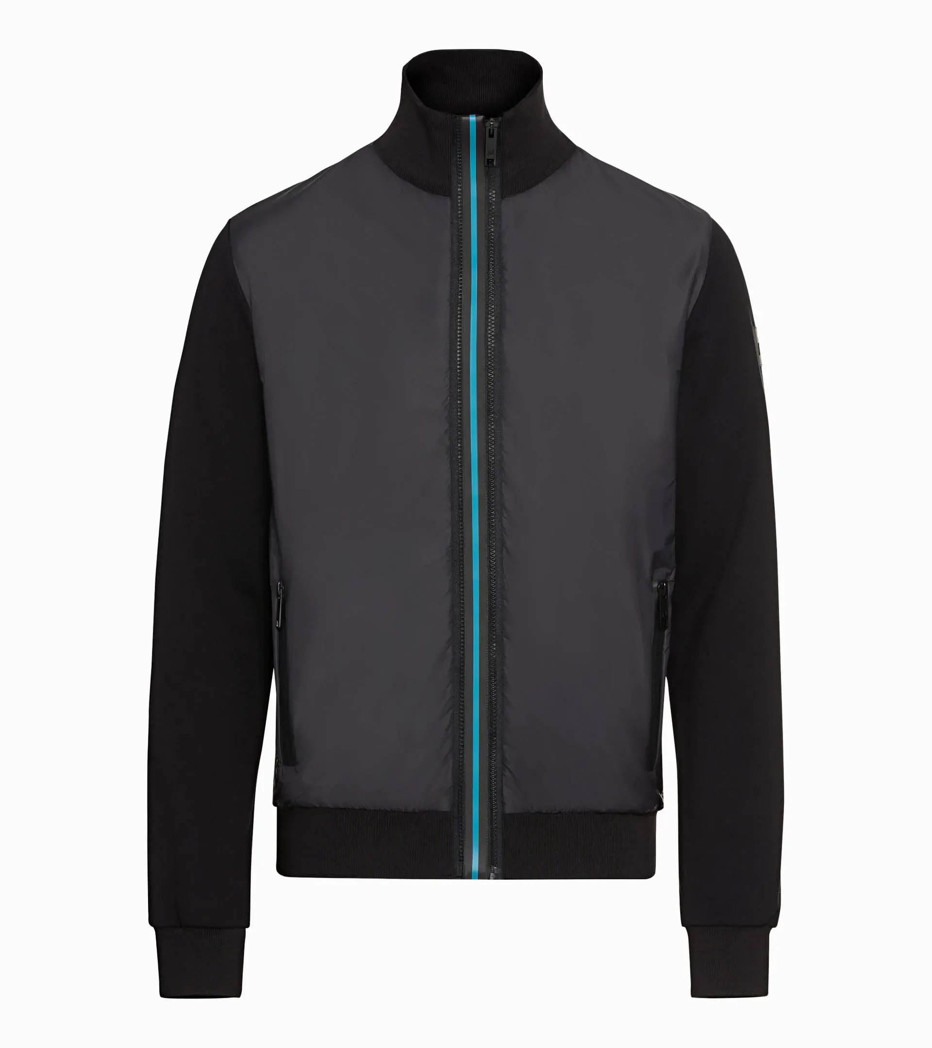 El todoterreno entre las chaquetas de punto para hombre: el cárdigan en mezcla de nailon funcional de Porsche Design. Este cárdigan de cuello alzado presenta un aspecto muy dinámico gracias a su moderna combinación de materiales —parte delantera y trasera de nailon italiano fino, mangas de punto de algodón suave—, conservando al mismo tiempo la máxima comodidad. La cremallera doble inteligente que puede llevarse de dos maneras aumenta aún más el estilo y la comodidad. La cremallera termosellada negra ajusta perfectamente la chaqueta al cuerpo. Si se utiliza la segunda cremallera, el corte de la chaqueta se hace algo más amplio y se puede ver la solapa engomada con tiras en color azul claro. Función y diseño en una sola prenda, con un estilo distinto para cada ocasión y estado de ánimo. Las cremalleras de los bolsillos verticales, también termoselladas, realzan el carácter técnico y las líneas puras de esta chaqueta de punto; la insignia con el icono de Porsche Design en la parte superior del brazo, así como los detalles de Porsche Design a medida, su carácter exclusivo. No en vano, esta prenda híbrida es un éxito de ventas de Porsche Design.