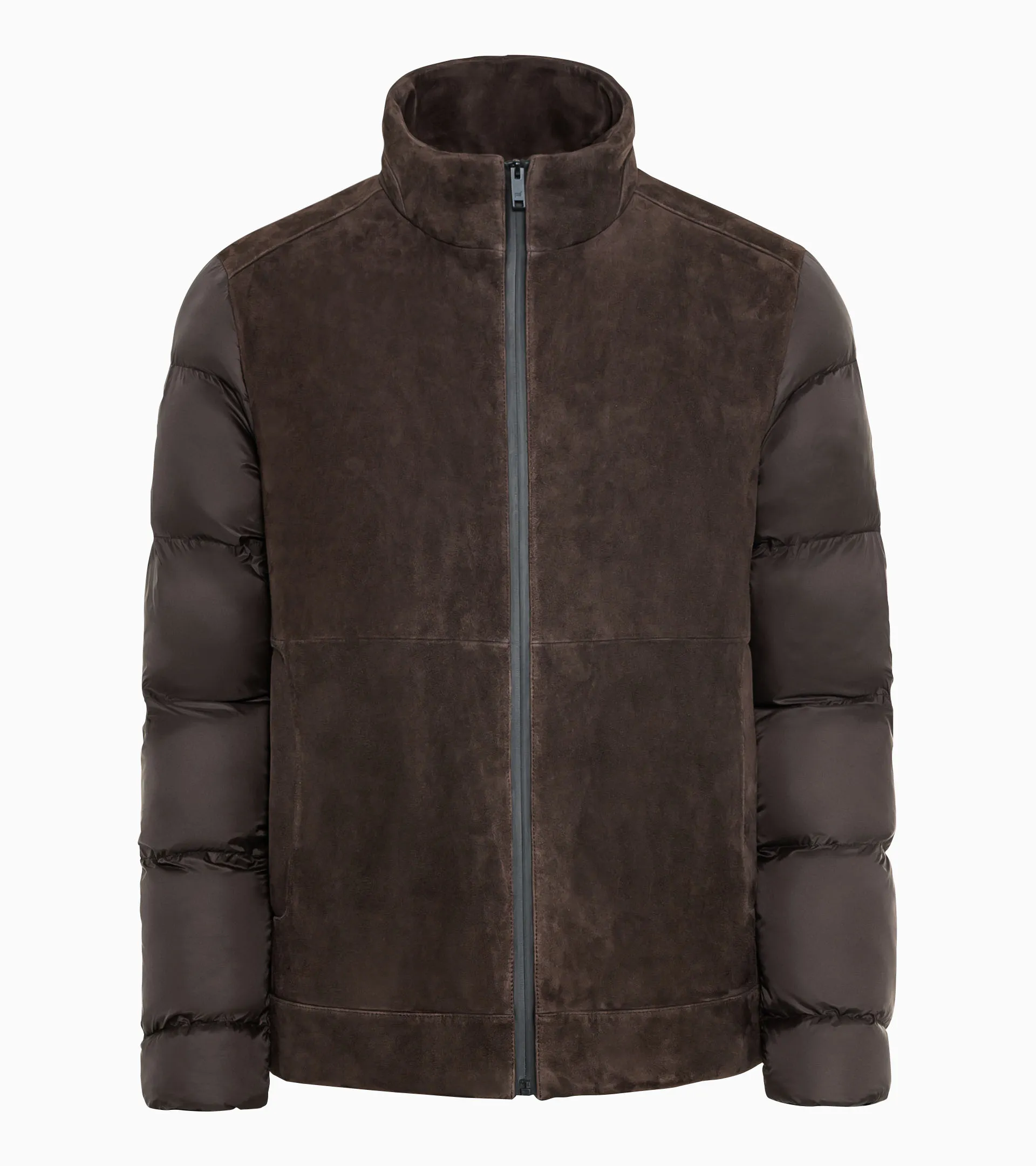 La Hybrid Suede Leather de Porsche Design juega hábilmente con las proporciones y los materiales y se convierte así en una compañera exclusiva y polivalente para los días más fríos. El tacto de alta calidad del ante de cabra color marrón espresso en la parte delantera y trasera se realza con las mangas acolchadas confeccionadas en nailon del mismo color, dándole un toque sofisticado. El juego de texturas y acabados en contraste crea un aspecto único y muy atractivo: masculino y moderno. Todo ello se ve subrayado por detalles técnicos como las cremalleras selladas visibles en la parte delantera y en las mangas, los bolsillos ribeteados con cierre magnético y el sencillo cuello alto con ribete interior estampado de Porsche Design. El acolchado ligero y sin plumón garantiza un nivel de calidez adecuado y confortable.