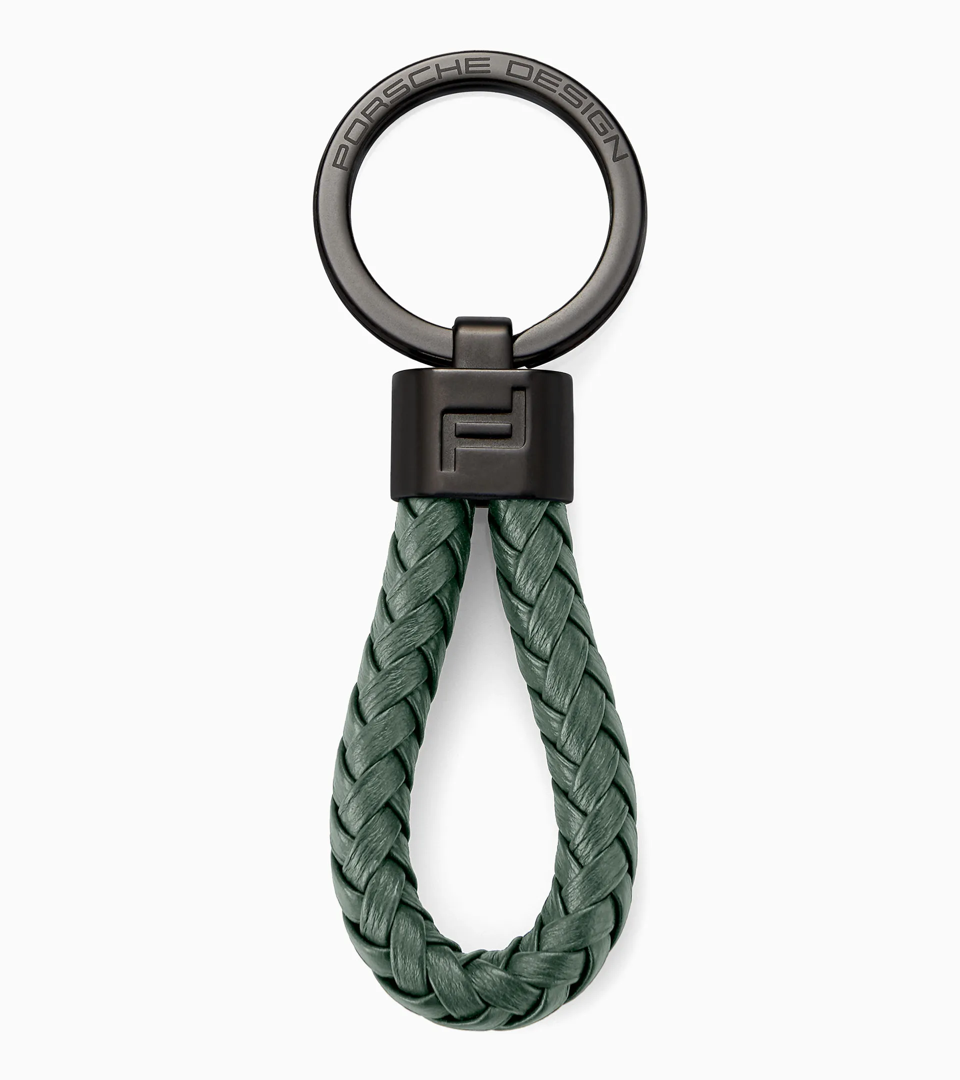 Llavero Porsche Design con correa de cuero trenzada y anillo grabado.