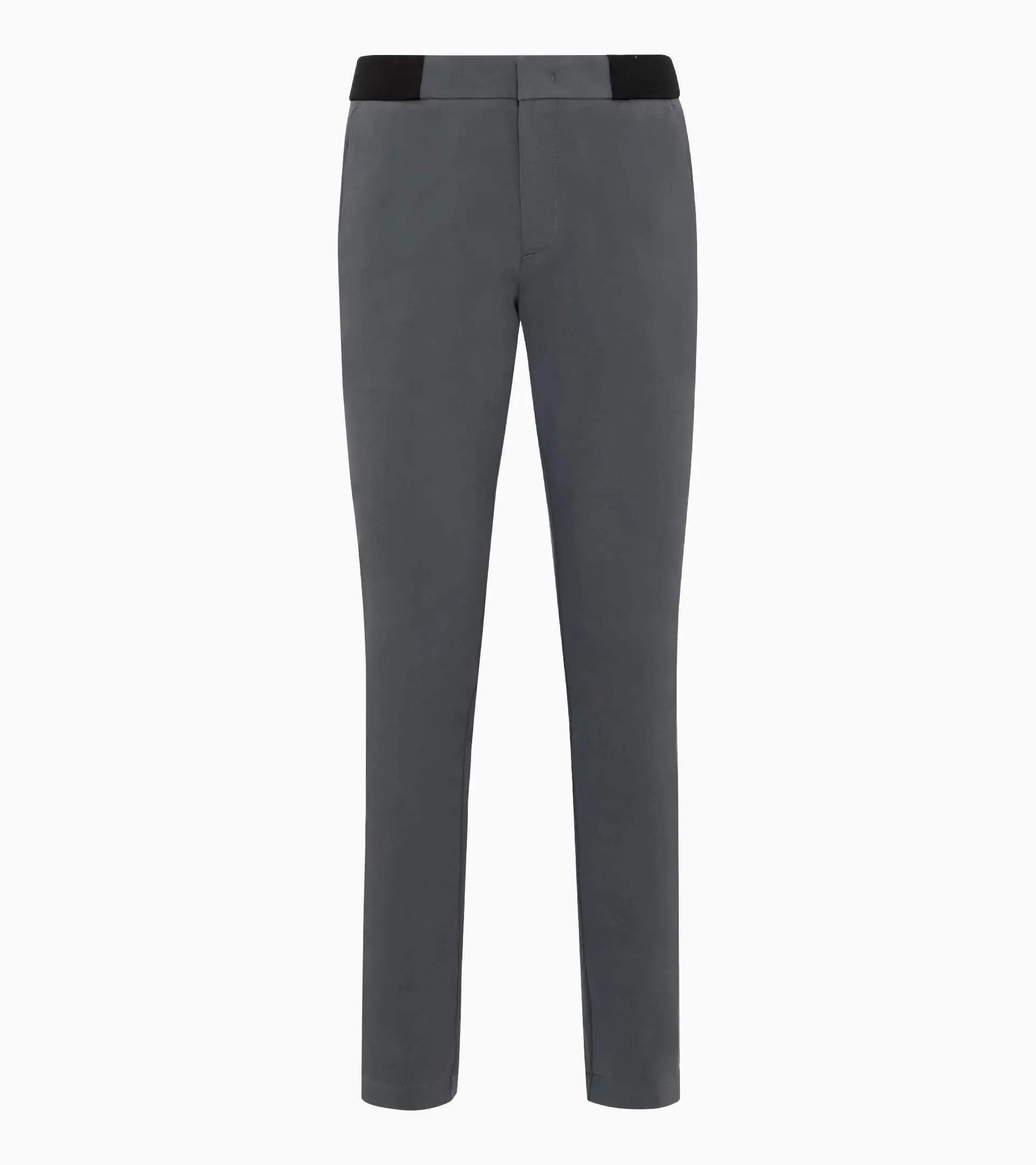Con un nuevo diseño al que se le han añadido numerosos detalles exclusivos, los Knit Detail Seasonal Chino de Porsche Design en color gris asfalto serán los favoritos de su armario. Estos pantalones de hombre con corte ajustado están confeccionados en algodón con elastano y garantizan un ajuste perfecto. La cinturilla parcialmente tejida con cierre de gancho y las rayas contrastantes en llamativo color azul lago de su interior aportan a los chinos un aspecto elegante y deportivo. Un diseño muy sencillo con bolsillos franceses en la parte delantera y bolsillos ribeteados dobles en la parte trasera y el logo metálico de PD le confieren un look casual chic urbano perfecto.