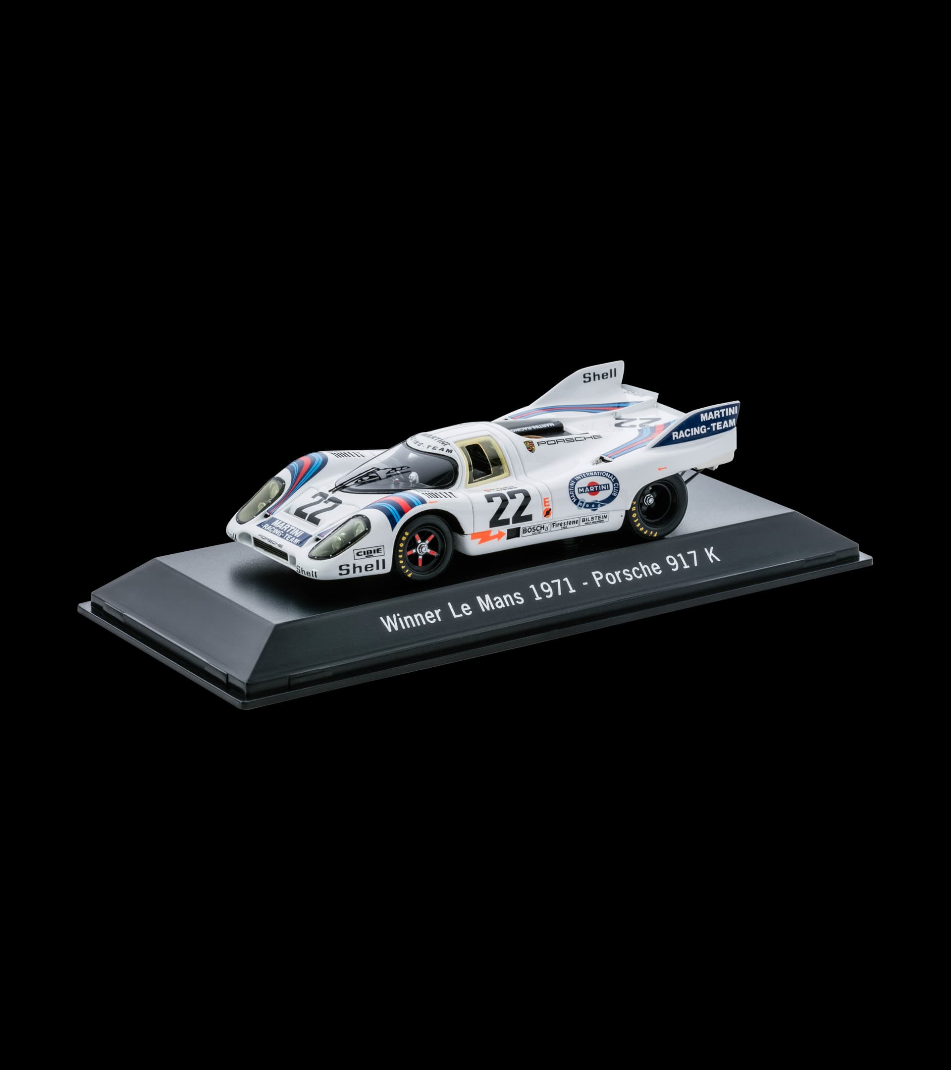 Este modelo de coleccionista del Porsche 917 KH está fabricado con todo lujo de detalles y es de alta calidad, por lo que quedará espectacular en su estantería o en su escritorio. Con su caja de regalo, causará gran sensación pese a su reducido tamaño. Con el número de salida 22, el 917 de cola corta cruza la línea de meta como ganador de la carrera de las 24 horas de Le Mans. Con una velocidad media de 222,3 km/h y un recorrido de 5335 kilómetros, los pilotos Gijs van Lennep y Helmut Marko establecieron dos récords que se mantendrían durante 39 años. Su Porsche con los colores de Martini Racing tiene las nuevas «aletas de tiburón» en la parte trasera, como se vio por primera vez en la sesión previa al entrenamiento en abril. Las aletas le aportan estabilidad direccional a este coche de carreras de 600 CV y reducen la resistencia del aire.