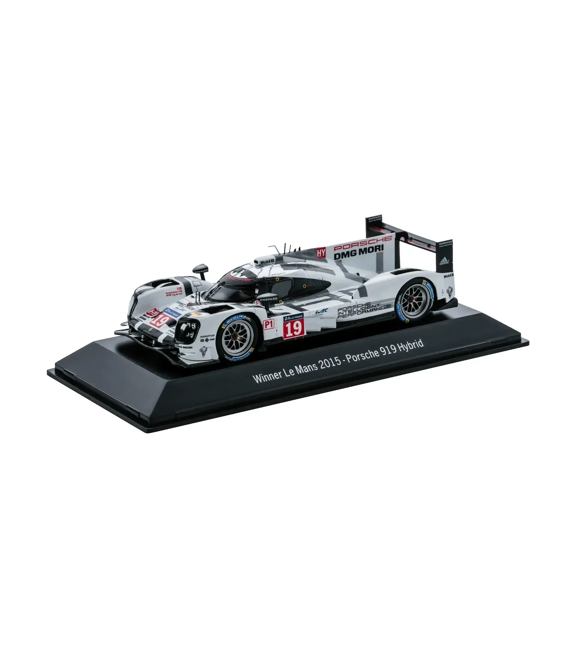 Este modelo de coleccionista del Porsche 919 Hybrid está fabricado con todo lujo de detalles y es de alta calidad, por lo que quedará espectacular en su estantería o en su escritorio. Con su caja de regalo, causará gran sensación pese a su reducido tamaño. Tras una ausencia de 16 años, Porsche regresó a la categoría reina del Campeonato Mundial de Resistencia (WEC) en 2014 y, con ello, a las 24 Horas de Le Mans. Con una potencia del sistema de más de 662 kW (900 CV), el 919 Hybrid es un coche extremadamente complejo que ha sido desarrollado desde cero, convirtiéndose en el laboratorio de pruebas más rápido y el coche de carreras más innovador construido por Porsche hasta ese momento. En 2014, Porsche logró el tercer puesto en el ranking general. De camino, el 919 logró cuatro poles y, al final, la primera victoria en las 6 Horas de São Paulo, Brasil. En 2015, el 919 Hybrid fue el vehículo dominante de la temporada del WEC. En las 24 Horas de Le Mans, el 919 Hybrid logró una doble victoria.