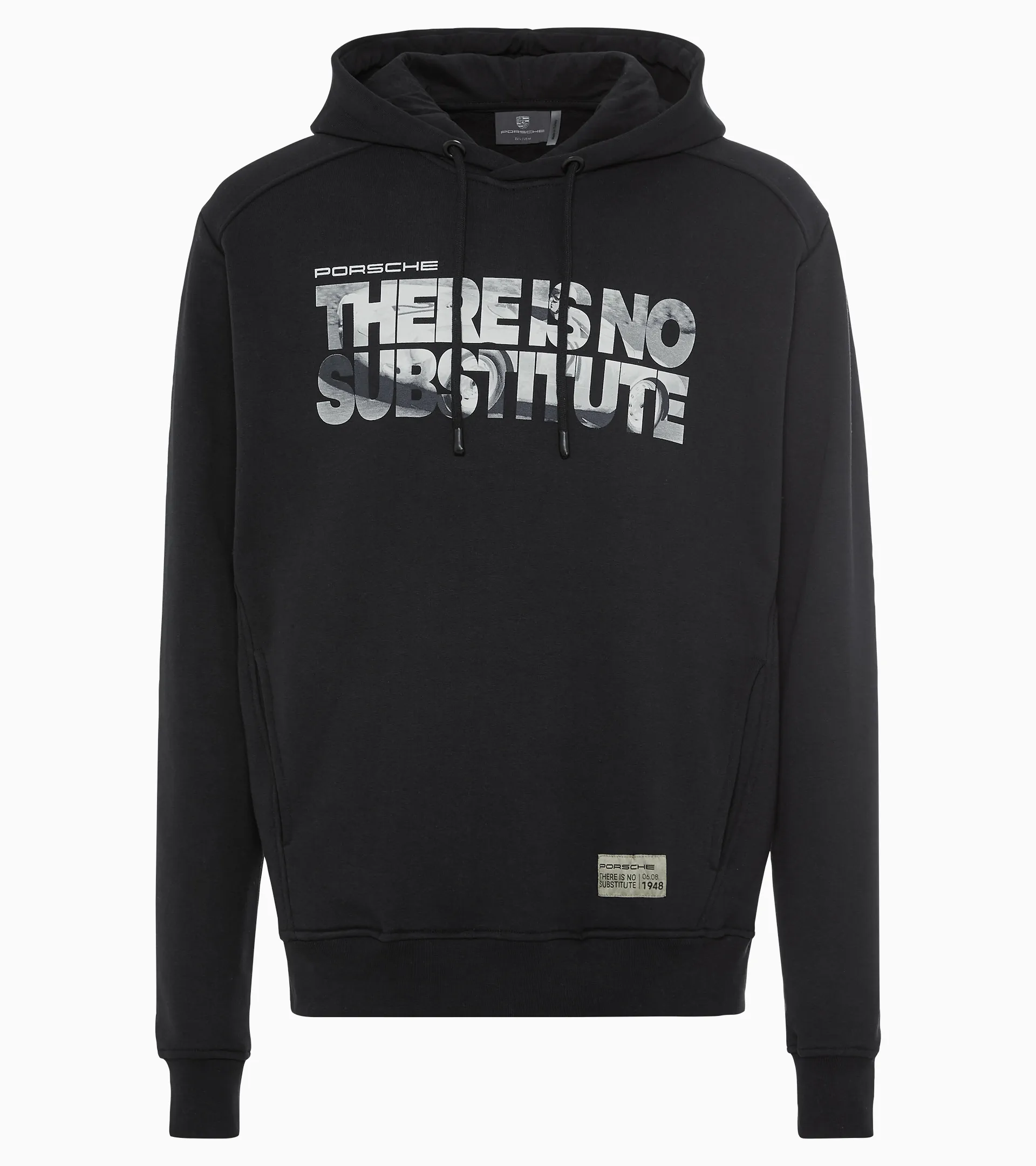 Moderna sudadera con capucha con estampado «Porsche. There Is No Substitute.» y gráfico del Porsche 550 Spyder en la parte delantera.