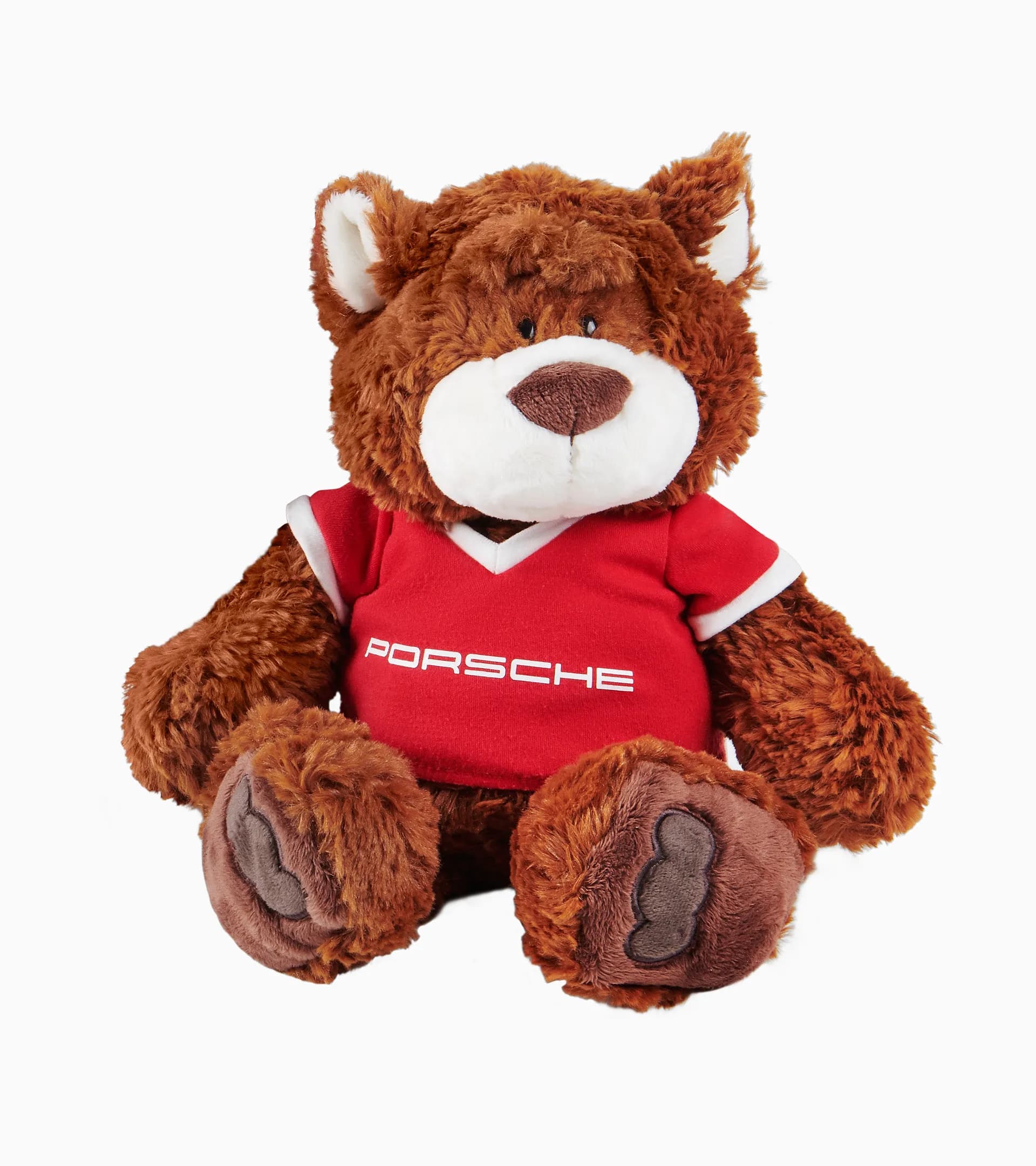 Un osito de peluche de felpa extra suave. Con una camiseta roja con el anagrama de Porsche.