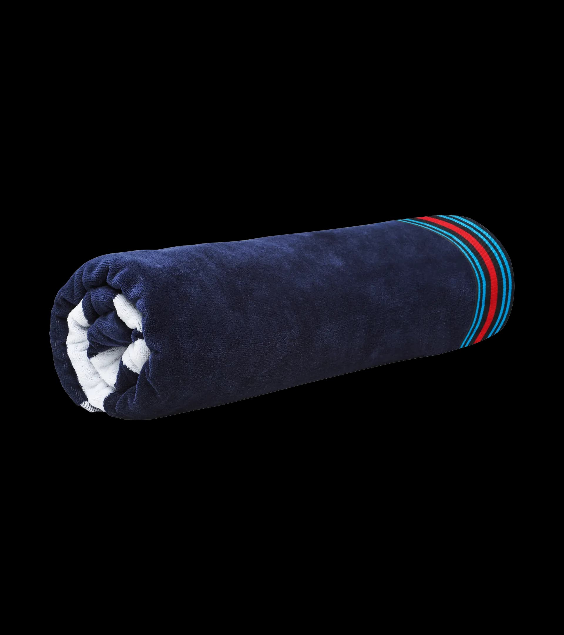 Toalla de tejido jacquard en diseño MARTINI RACING®, en suave terciopelo y parte inferior de rizo. Con bolsillo de velcro superpuesto en la parte posterior para objetos personales.