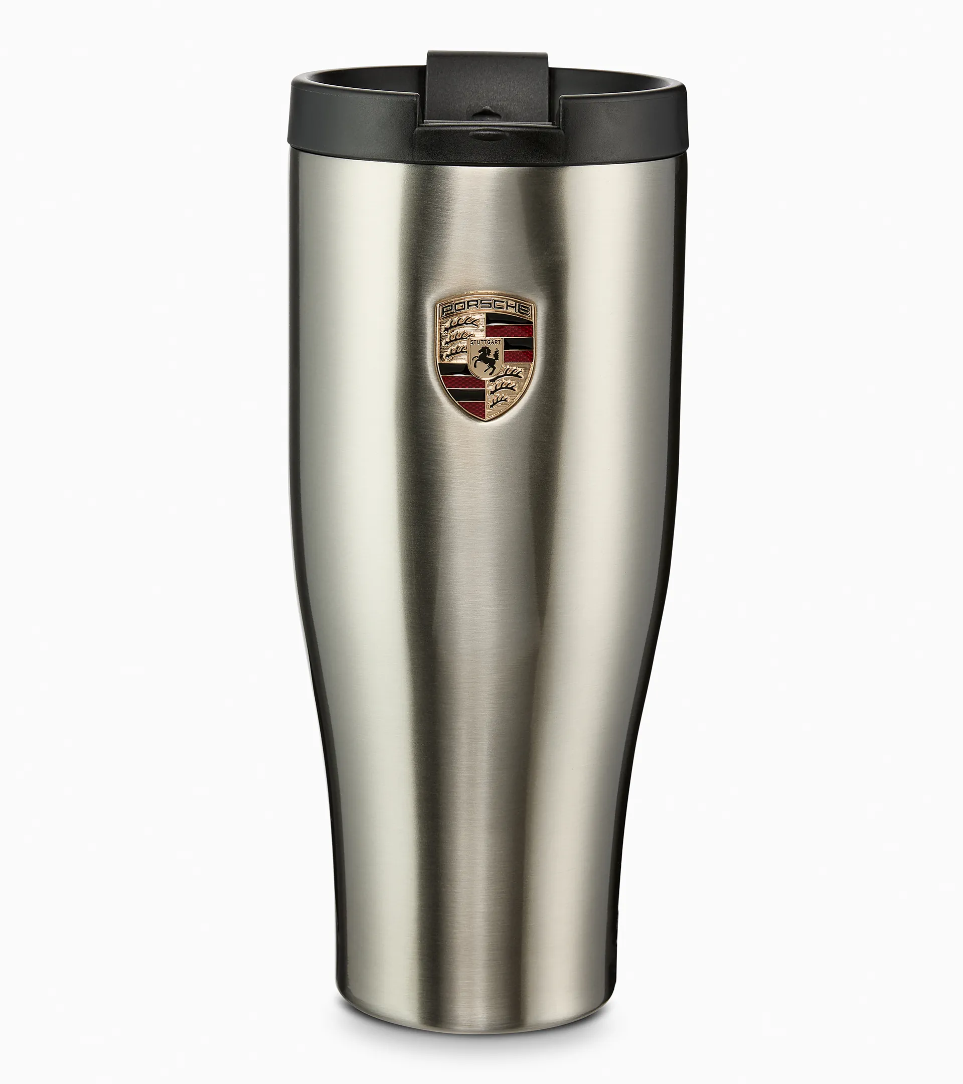 Alto rendimiento siempre a mano: el vaso isotérmico Porsche XL de acero inoxidable mantiene la temperatura de las bebidas calientes y frías. El cuerpo del vaso isotérmico está adornado con el escudo Porsche y la tapa tiene el anagrama Porsche grabado.