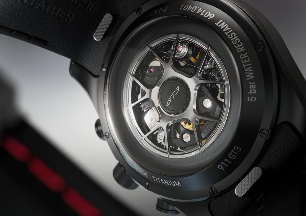 El Chronograph 911 GT3 y el Chronograph 911 GT3 con paquete Touring están accionados por un calibre WERK 01.200 de Porsche Design con certificación COSC y un «rotor 911 GT3» que recrea hasta el último detalle las llantas del vehículo.