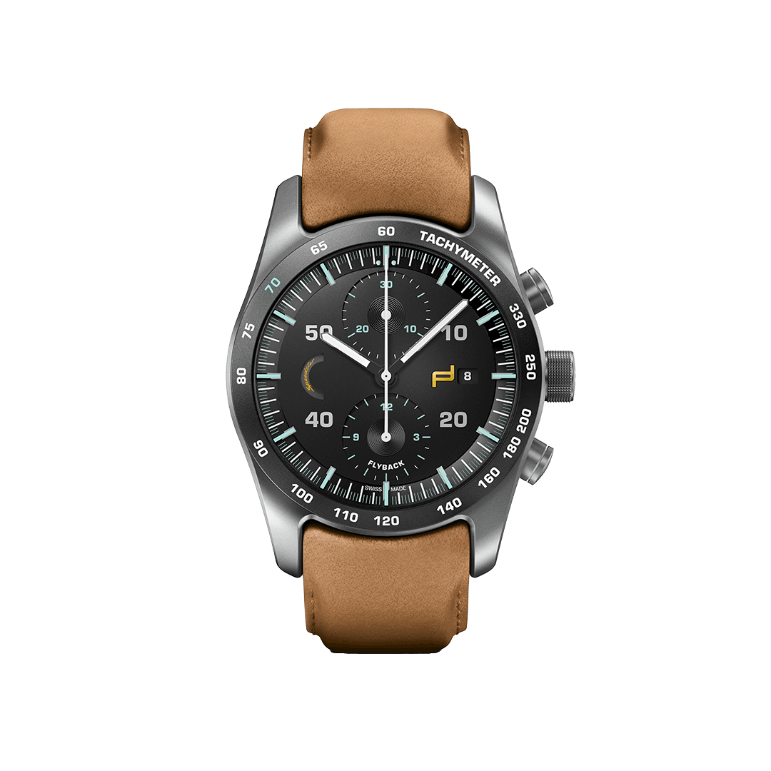El rotor del cronógrafo de Porsche Design está fabricado según el diseño de las llantas del 911 Speedster en Heritage Design. Un detalle especial: la fijación del extraordinario rotor con aspecto de anclaje central con el emblema de Porsche tiene un diseño histórico. Para personalizar el cronógrafo, el futuro propietario del reloj puede elegir entre un rotor en color Platino (satinado) y un rotor en color Plata.