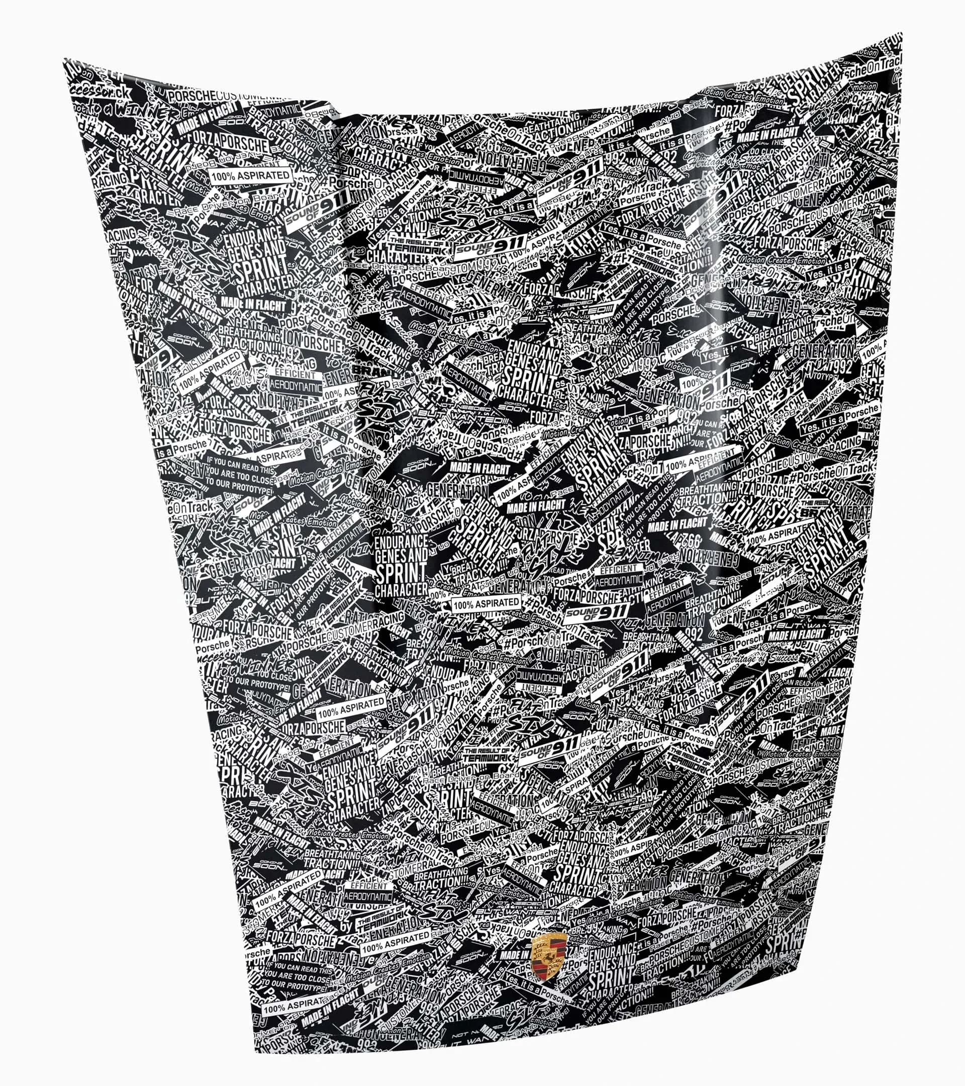 Original bonnet of the historic Porsche 911 (G model) in the design of the 911 GT3 R camo livery. Magnetic, with hanging device for wall mounting.